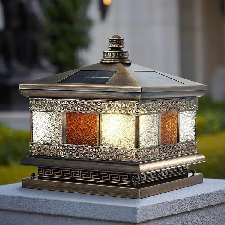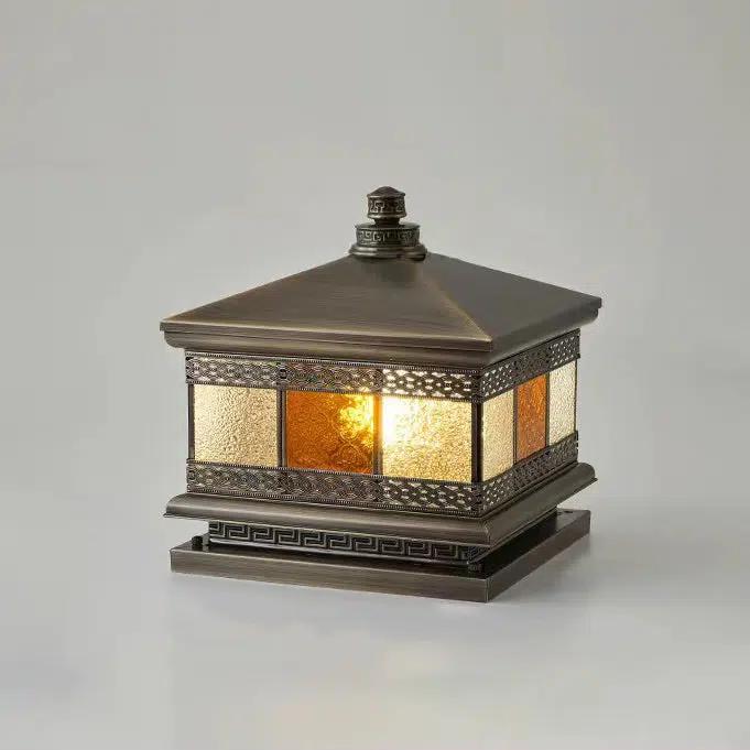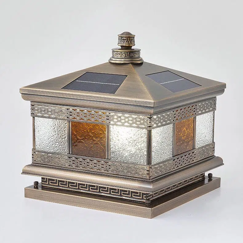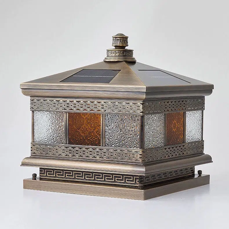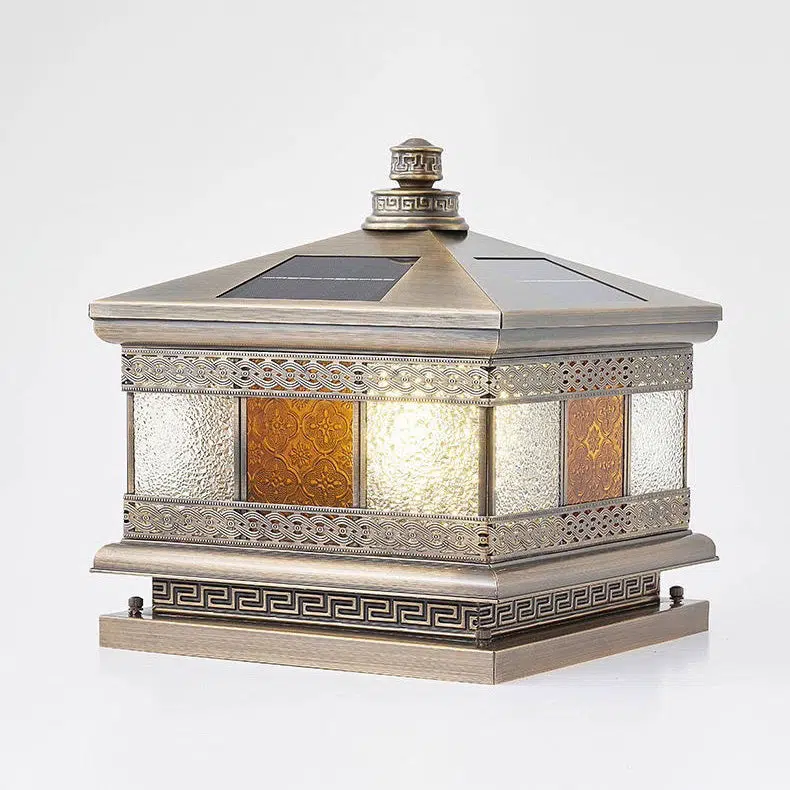 Contemporary Retro Solar Waterproof Copper Glass Square Palace Printed 1-Light LED Outdoor Pillar Light Landscape Lighting For Garden