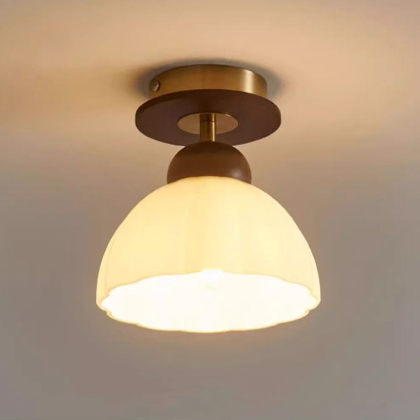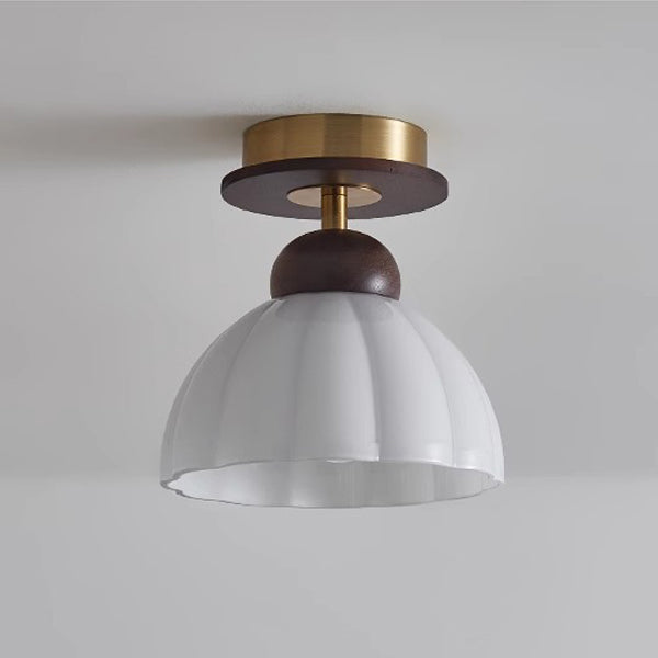 Contemporary Retro Walnut Wood Metal Glass Floral 1-Light Semi-Flush Mount Ceiling Light For Living Room
