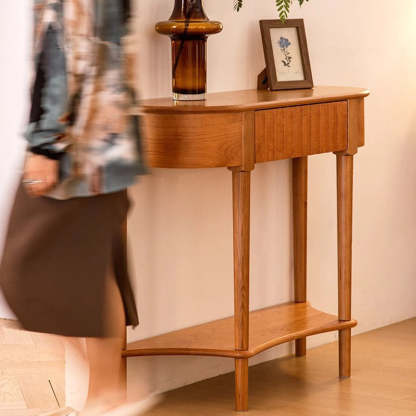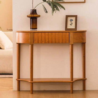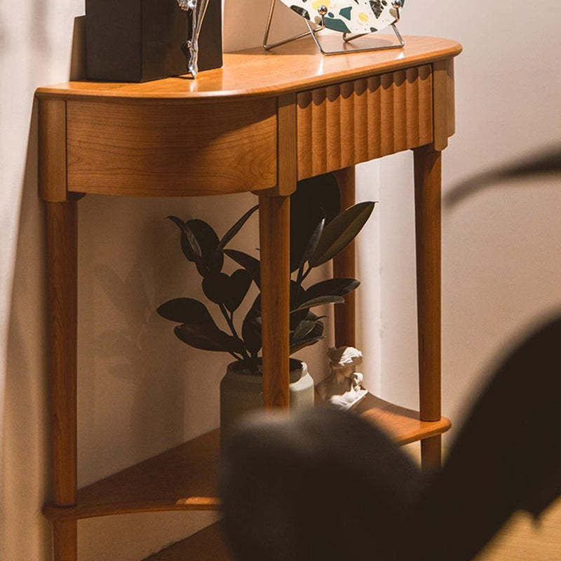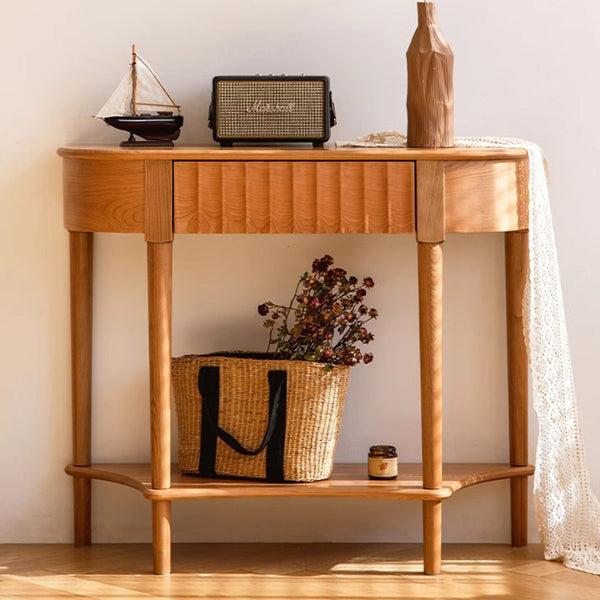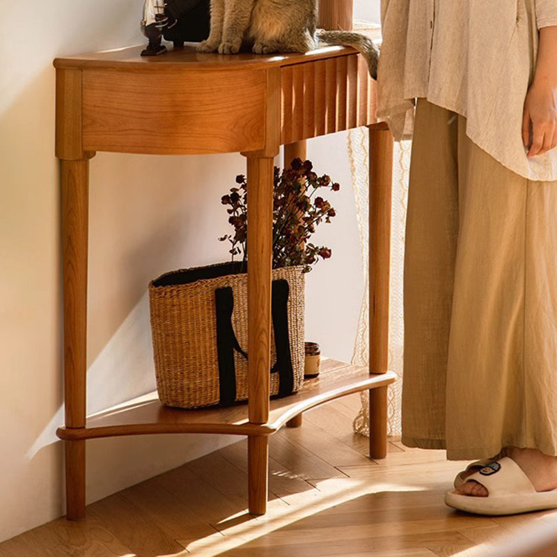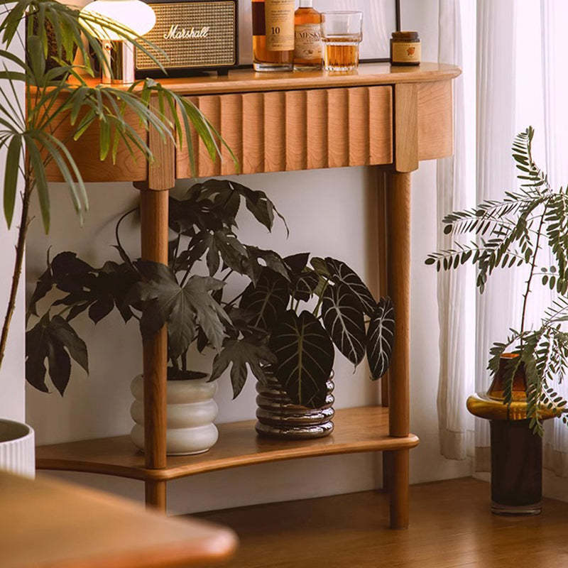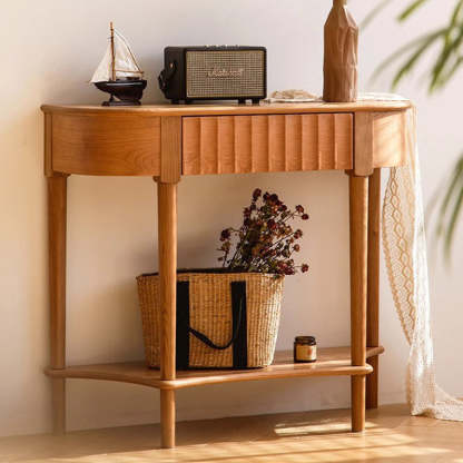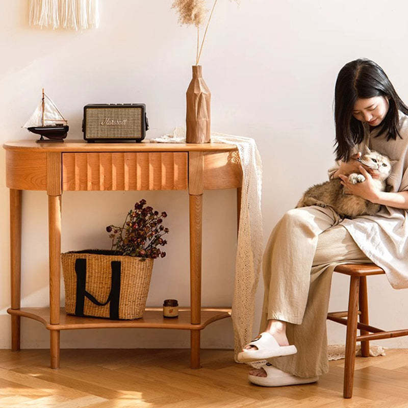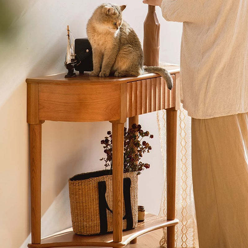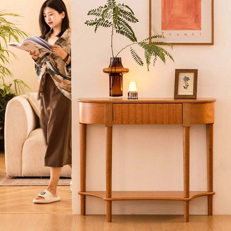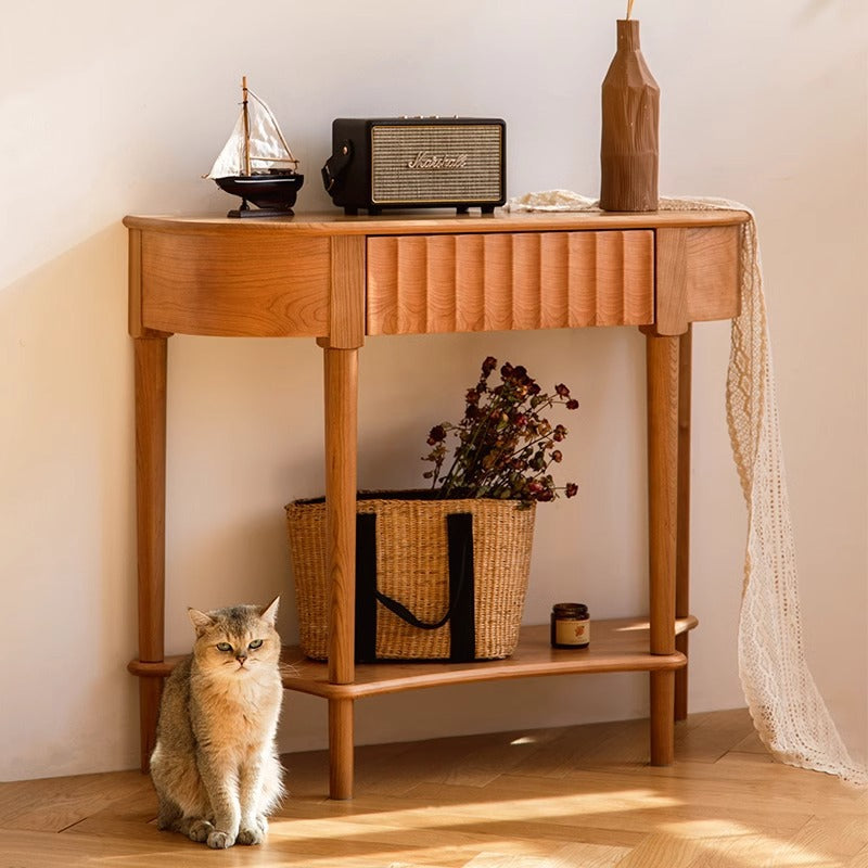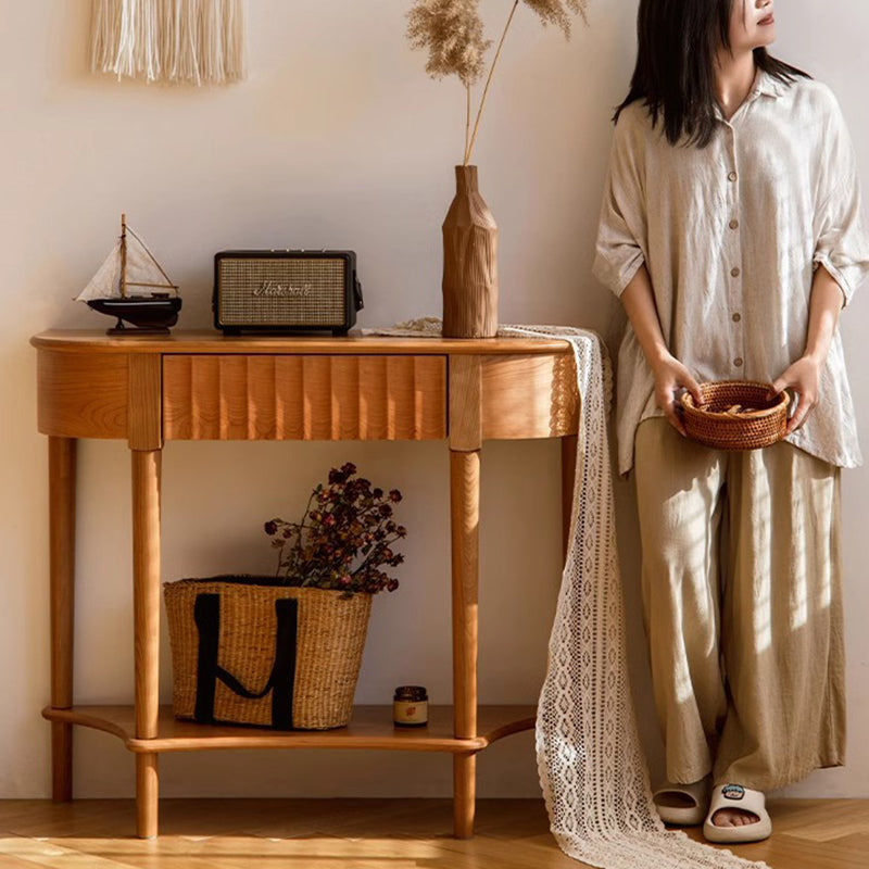 Crafted from solid cherry wood in a warm natural finish. this Scandinavian-style console table features a unique semi-circular shape and wavy drawer front. Designed with two tiers and a built-in drawer. it's perfect for narrow entryways. offering both style and practical storage.