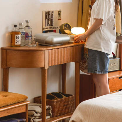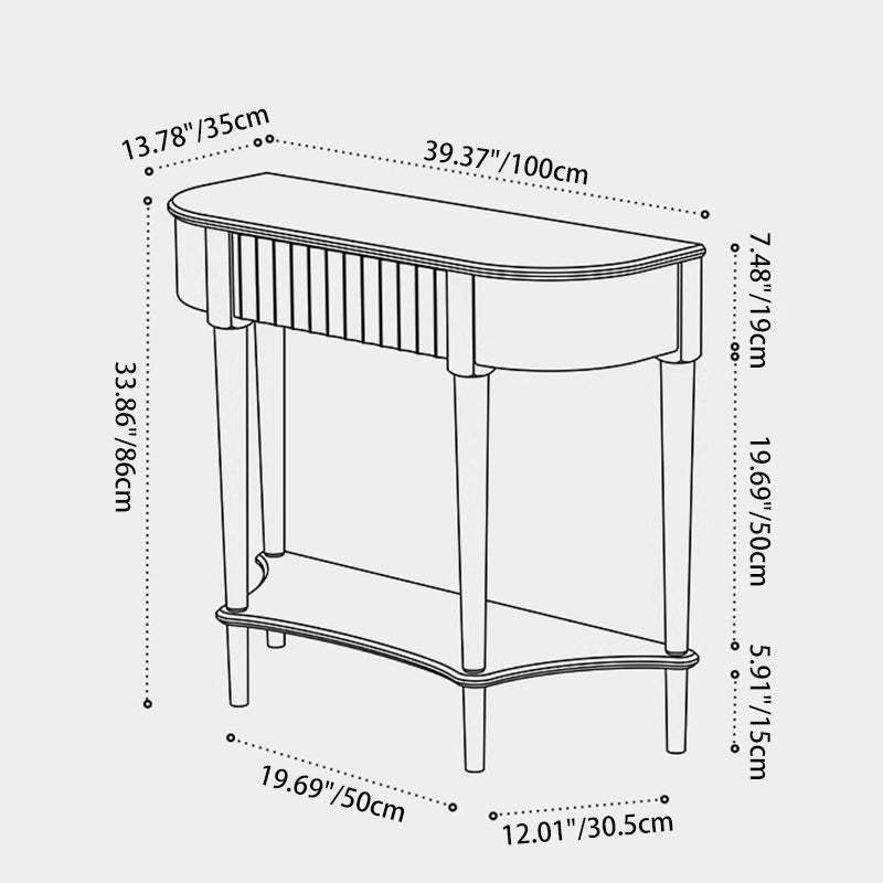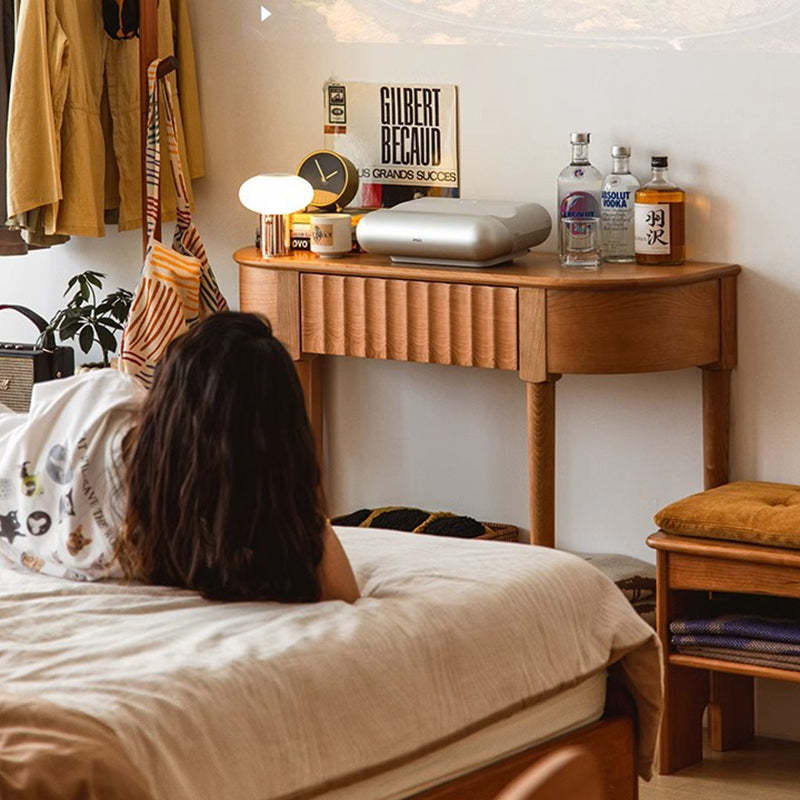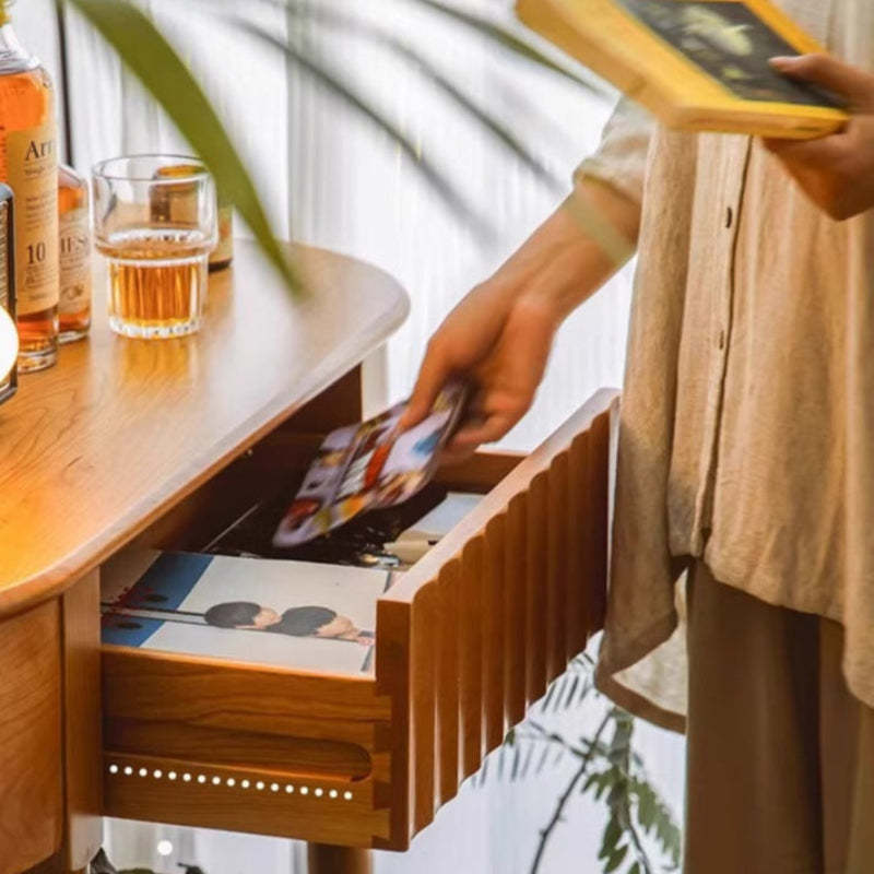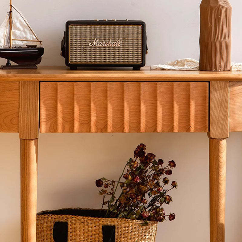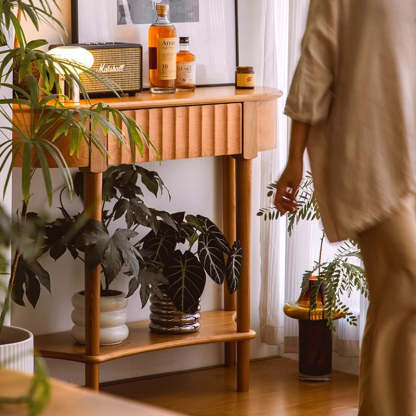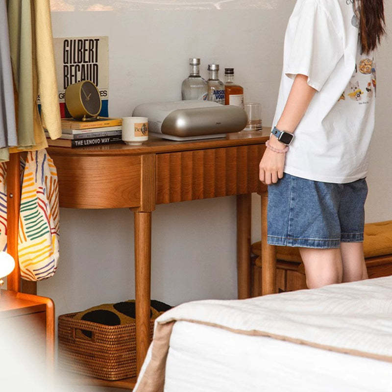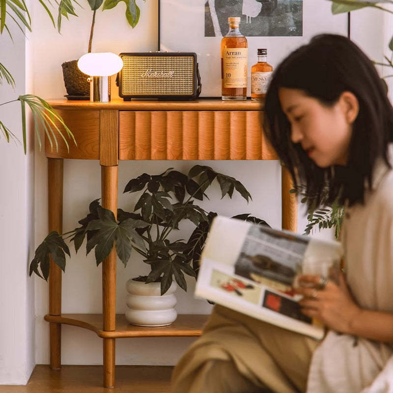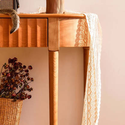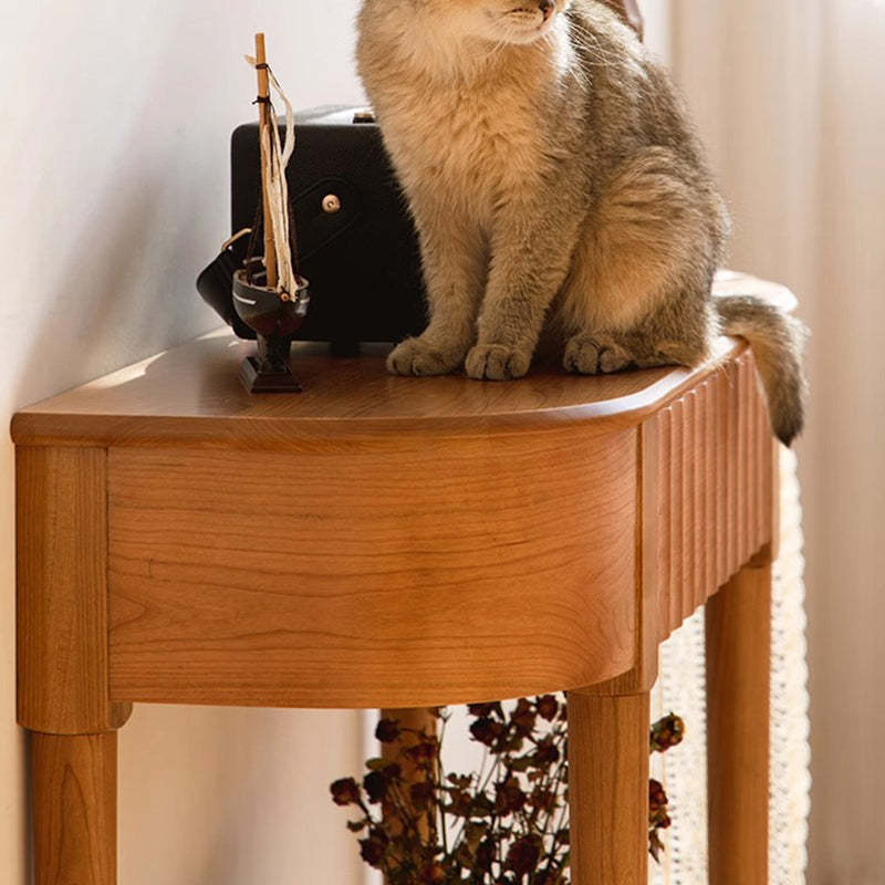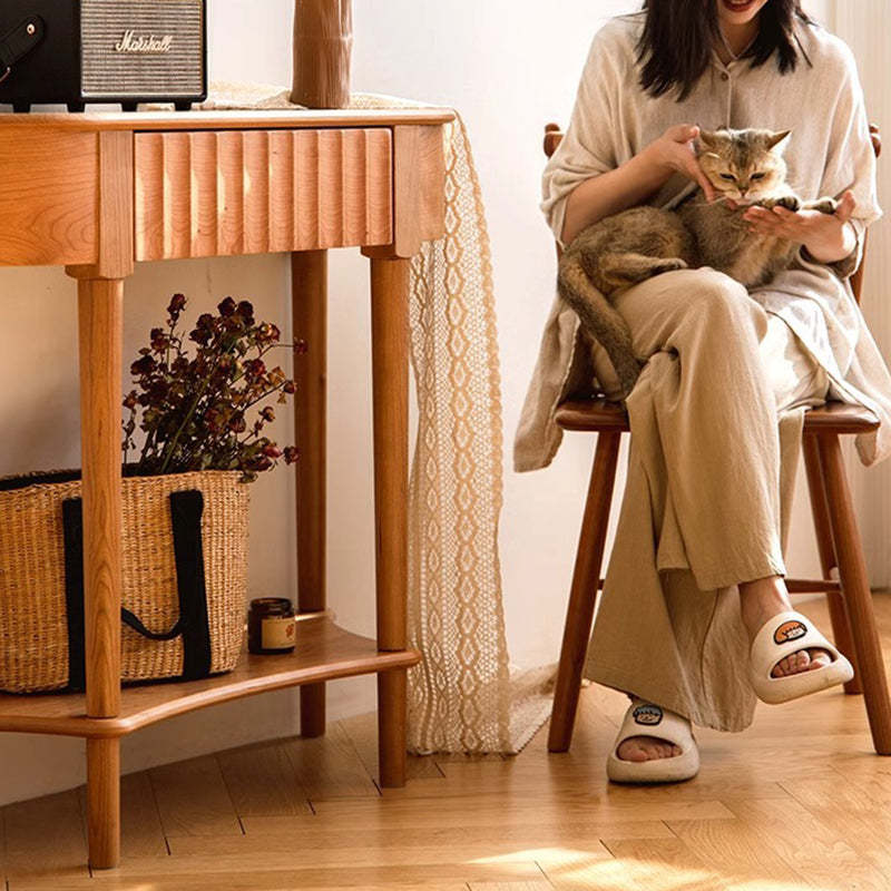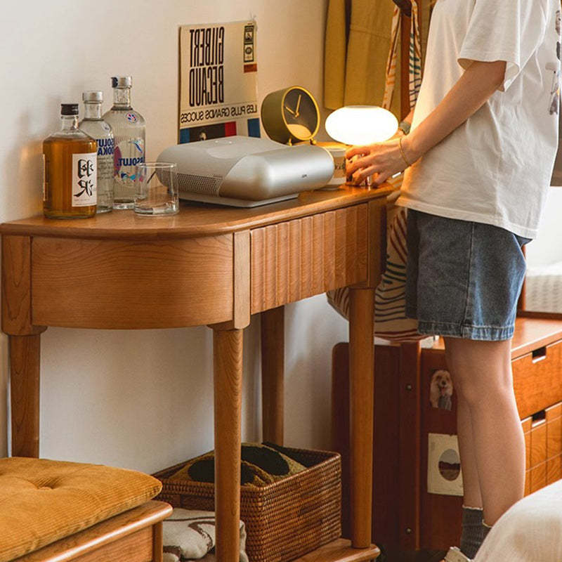 Crafted from solid cherry wood in a warm natural finish. this Scandinavian-style console table features a unique semi-circular shape and wavy drawer front. Designed with two tiers and a built-in drawer. it's perfect for narrow entryways. offering both style and practical storage.