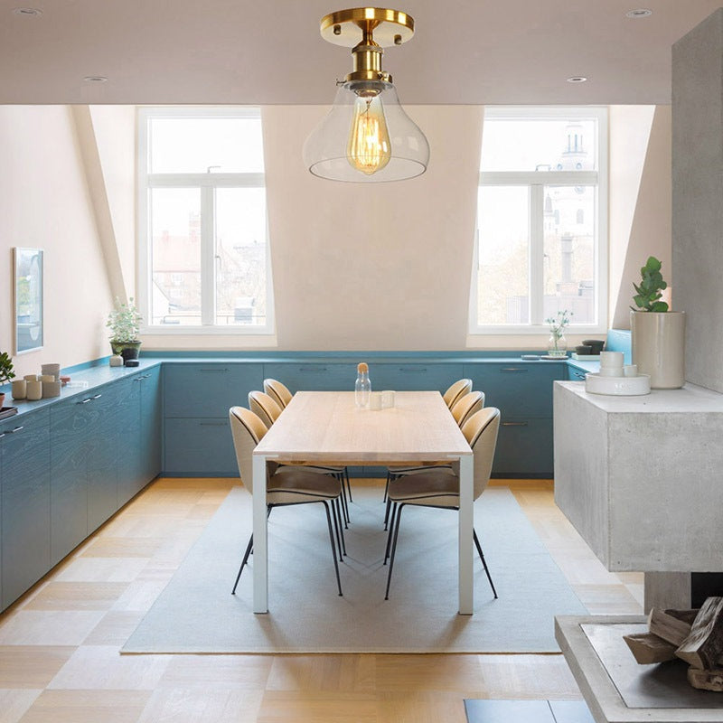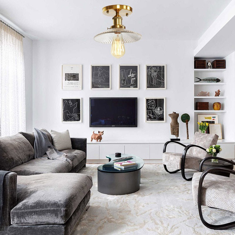 This gold-toned 1-light semi-flush mount ceiling light showcases a sleek round base paired with a fan-inspired glass shade. blending geometric elegance with warm. soft lighting. Designed in contemporary Scandinavian style. it’s perfect for adding subtle sophistication to living rooms and transitional spaces.