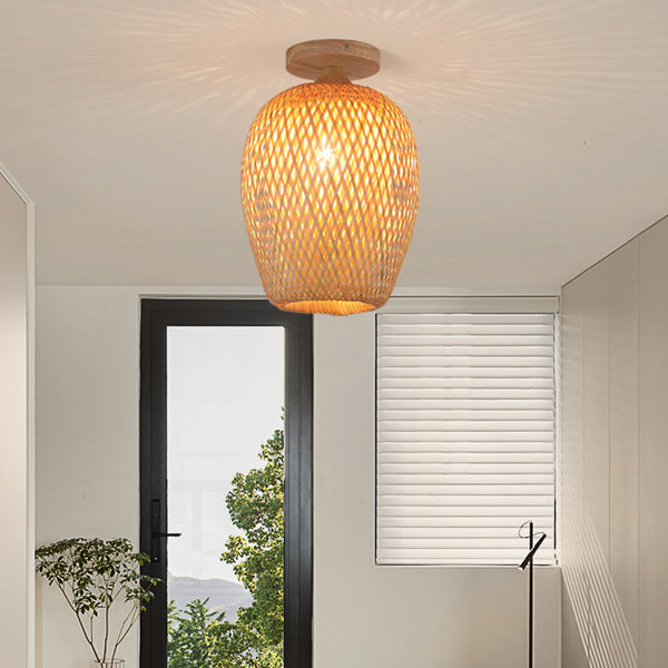 Contemporary Scandinavian Rubberwood Bamboo Woven Round 1-Light Semi-Flush Mount Ceiling Light For Living Room