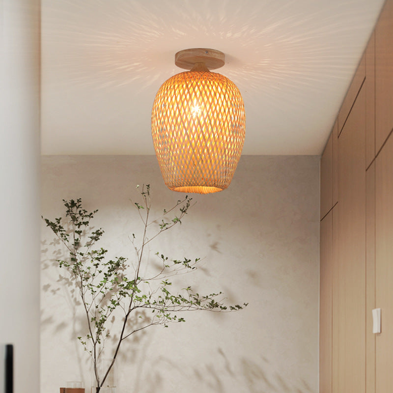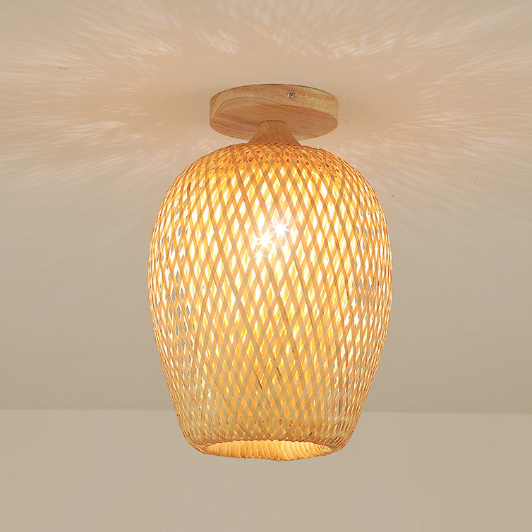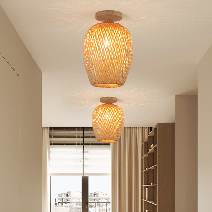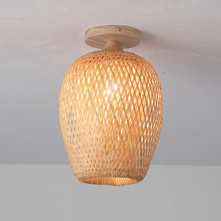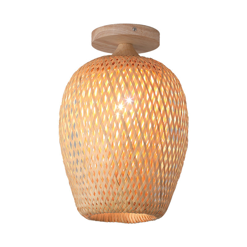 Contemporary Scandinavian Rubberwood Bamboo Woven Round 1-Light Semi-Flush Mount Ceiling Light For Living Room
