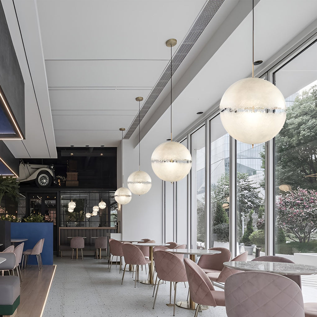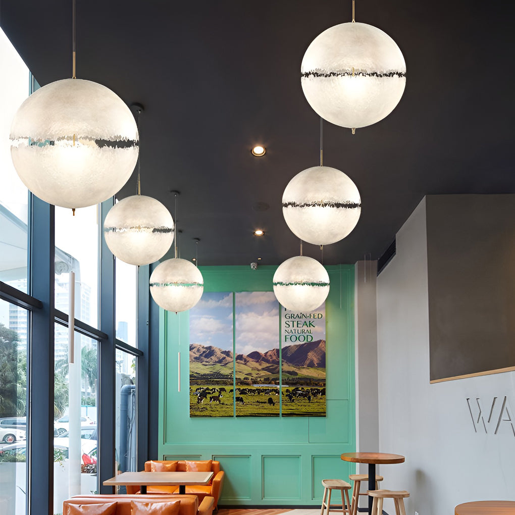 - The lunar chandelier is made of resin material. and the surface texture of the lamp body is natural and clear. And its light transmittance is high. and the light it transmits is bright and uniform without being dazzling.