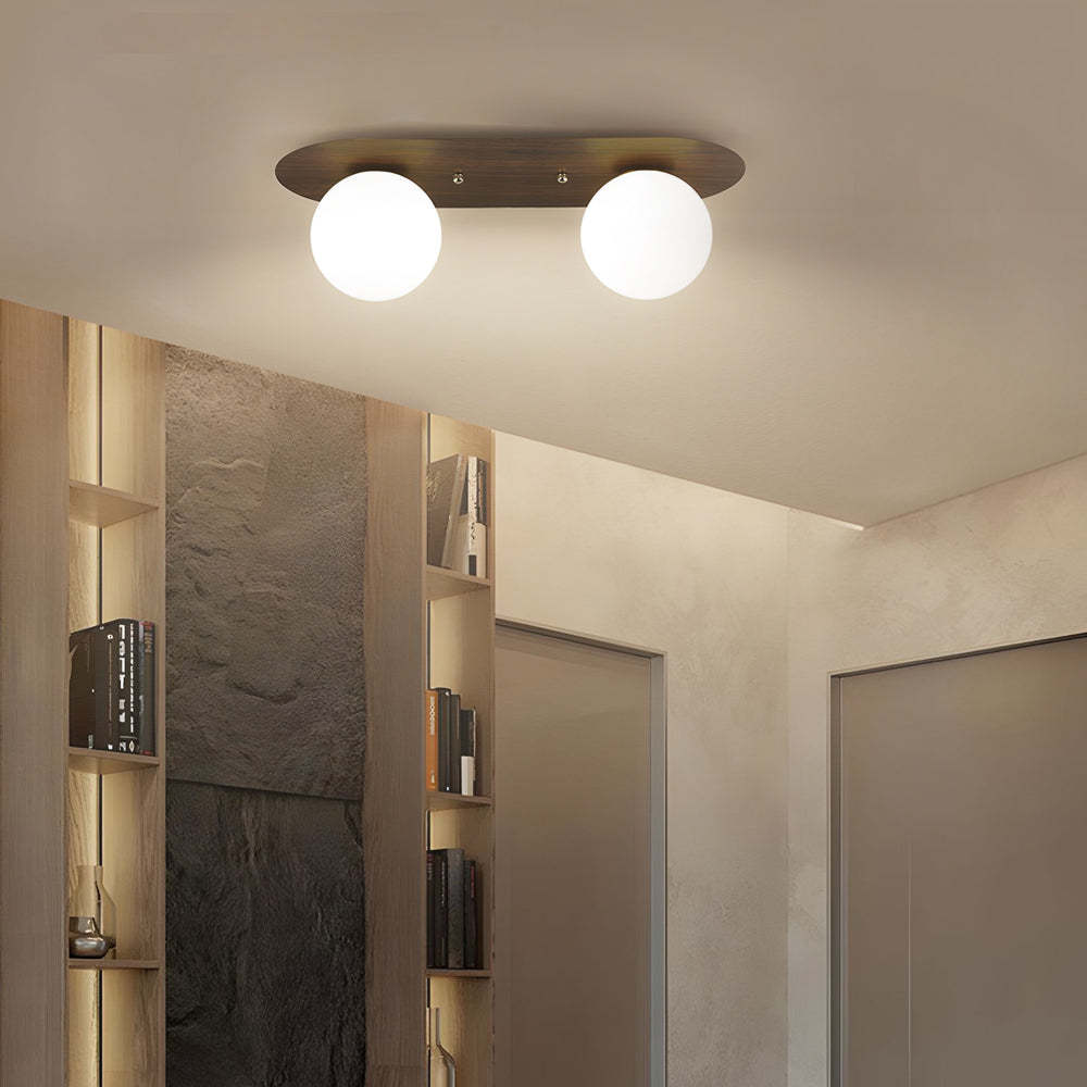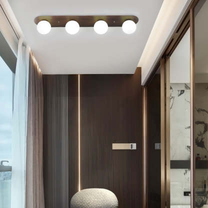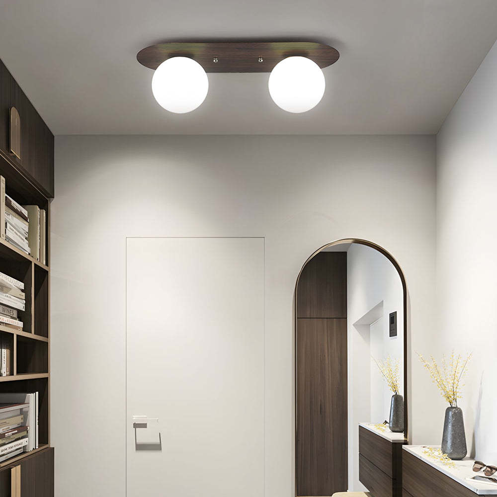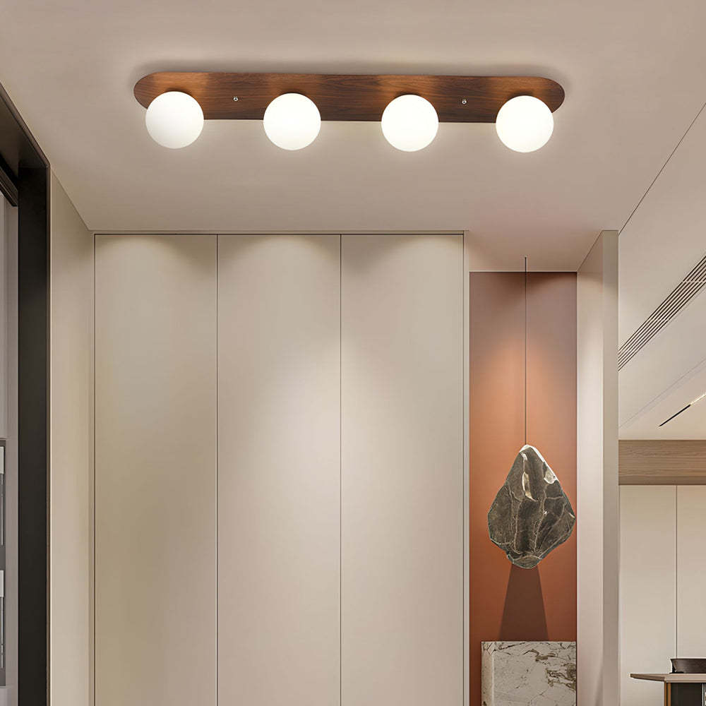 - The modern ceiling light features a sleek flush mounted wood board and stylish globe glass bulbs that complements a variety of interior decor themes. The walnut-colored fixture adds a touch of warmth and sophistication to any room. The thickened, milky white glass shades ensure even light distribution and create a soft, ambient glow that enhances the atmosphere of any room. Available in 2, 3, or 4 lights to suit different illumination needs.