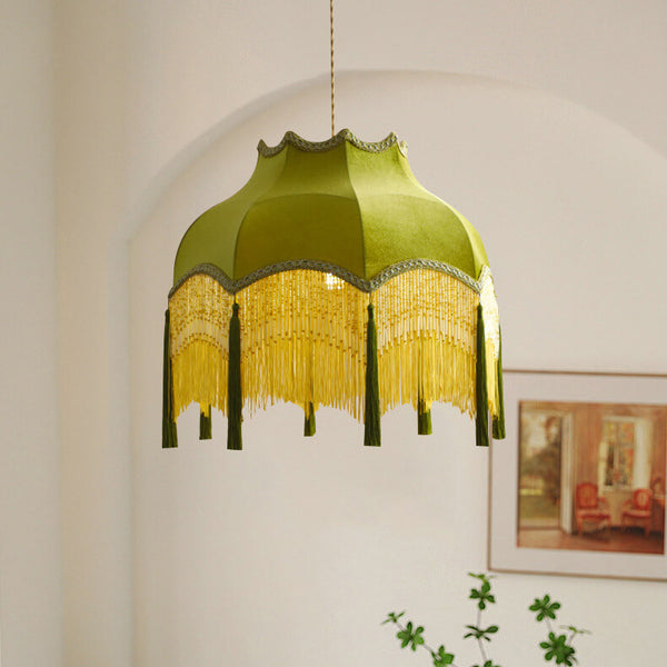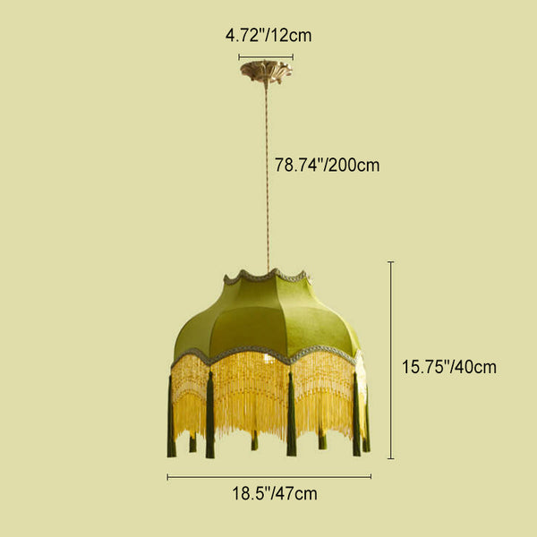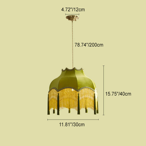 French Vintage Fabric Tassel Lampshade Brass 1-Light Pendant Light