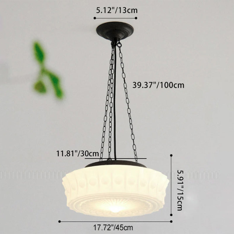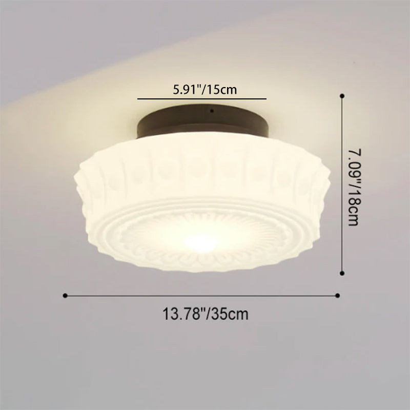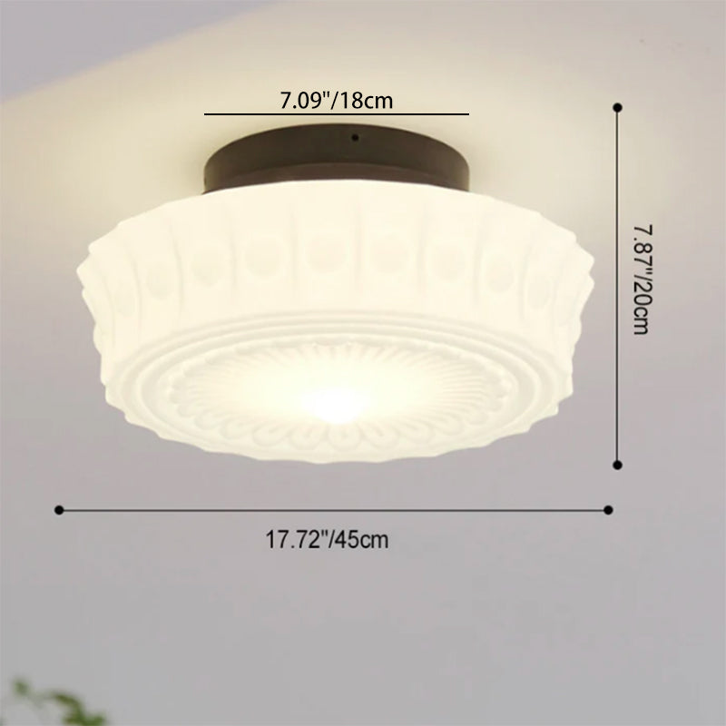 French Vintage White Jade Glass Stripes Round Drum LED Semi-Flush Mount Ceiling Light