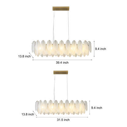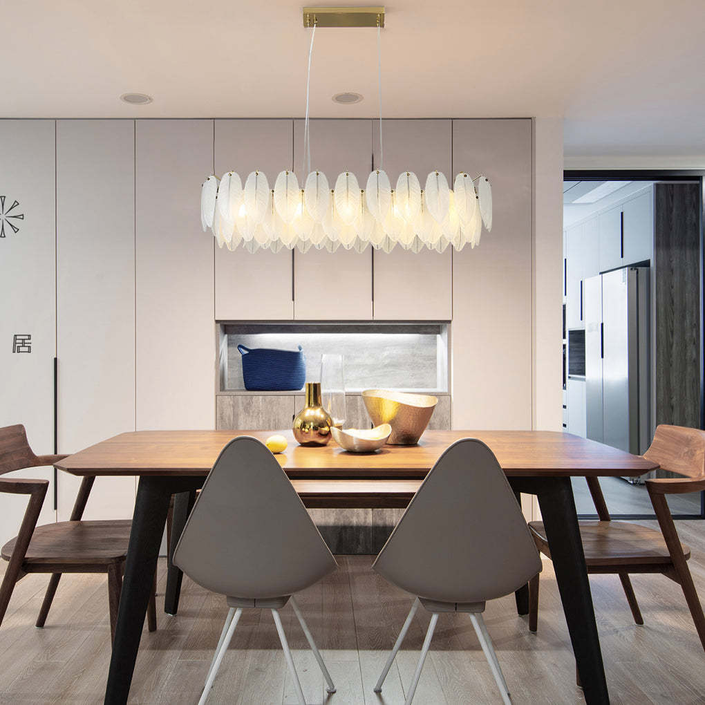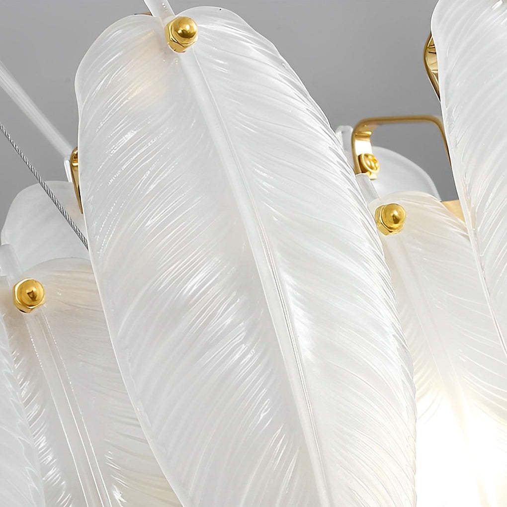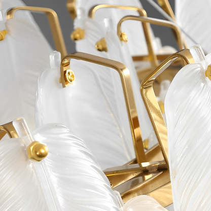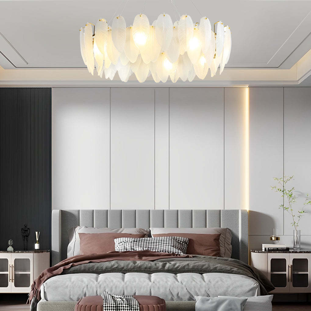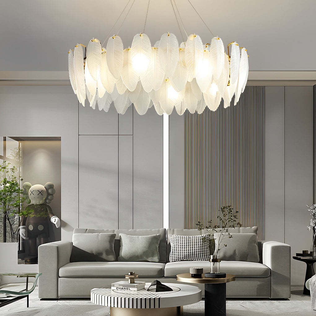 - This gorgeous chandelier features a feathers textured and shaped glass shade, the exquisitely crafted feathers glass shade is bright and comfortable, bringing a natural and tranquil ambiance to your home.