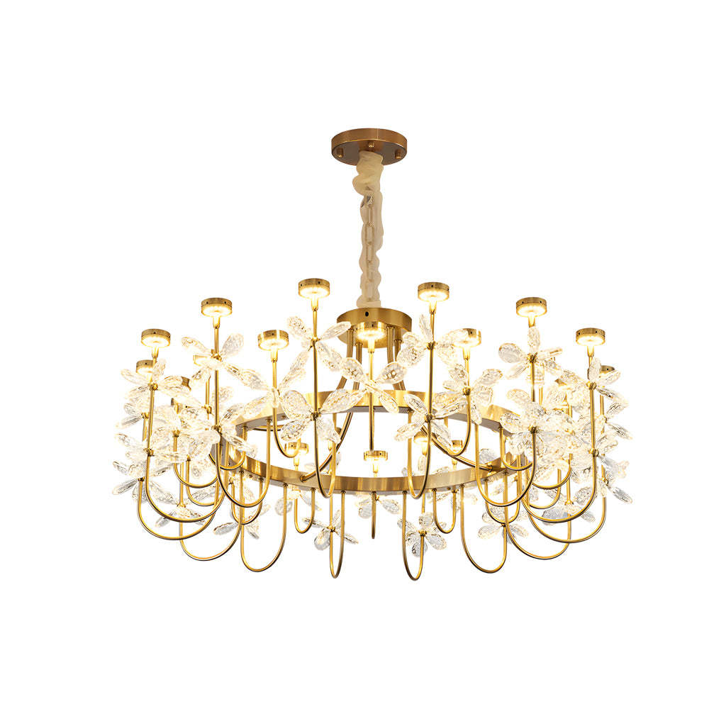 - The Flower Crystal Chandelier introduces a golden luxury looking of light and shadow to your surroundings. Delicate, graceful curved lamp arms extend from the ring, fully being adorned with crystal flowers. As the LED 24-light source delicately emanates from the top of each lamp arm, the crystal blooms catch and refract the light, casting a dazzling effect of light and shadow.