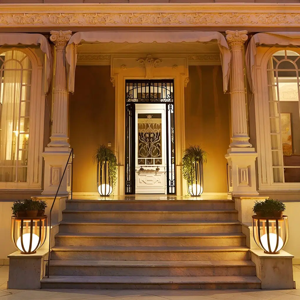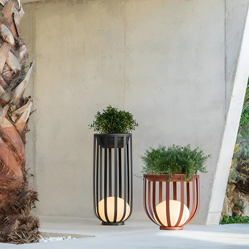 - Industrial style metal. PC lantern shape and a bright warm white solar-LED sphere. paired with a top tray design capture attention on a industrial accent outdoor floor lamp. adding sophistication and functionality for gardens. stairways. pathways and courtyards.