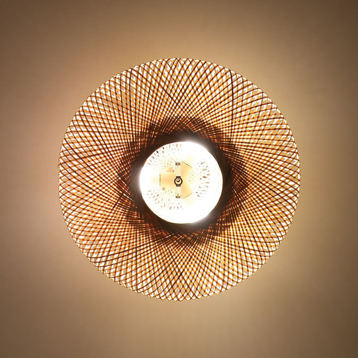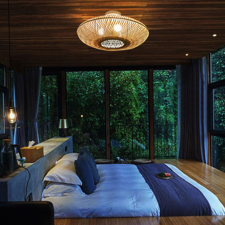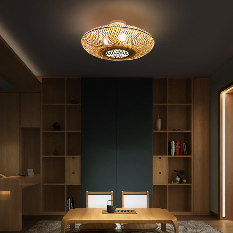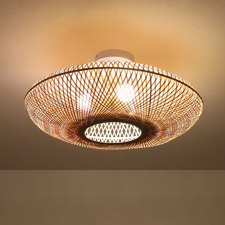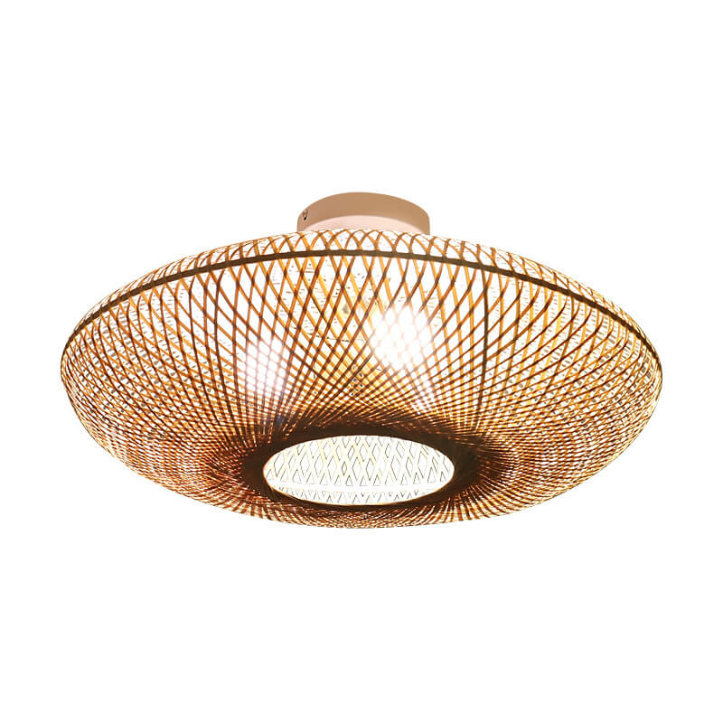 Japanese Bamboo Weaving Round Flying Saucer 3-Light Semi-Flush Mount Light