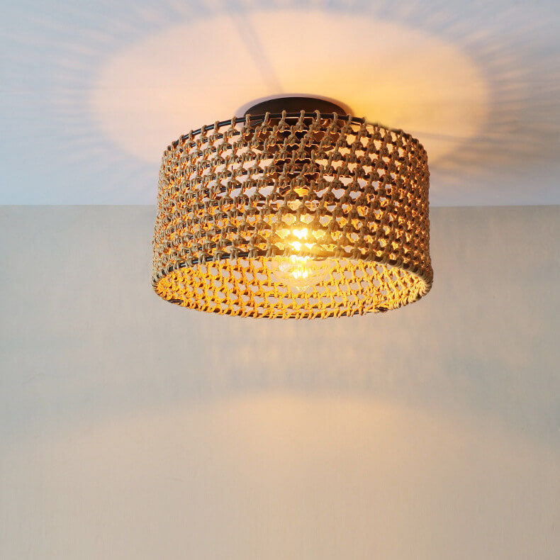 Japanese Wabi-sabi Hemp Rope Weaving Cylinder 1-Light Semi-Flush Mount Ceiling Light