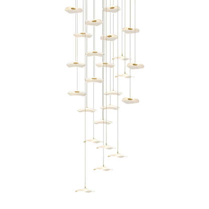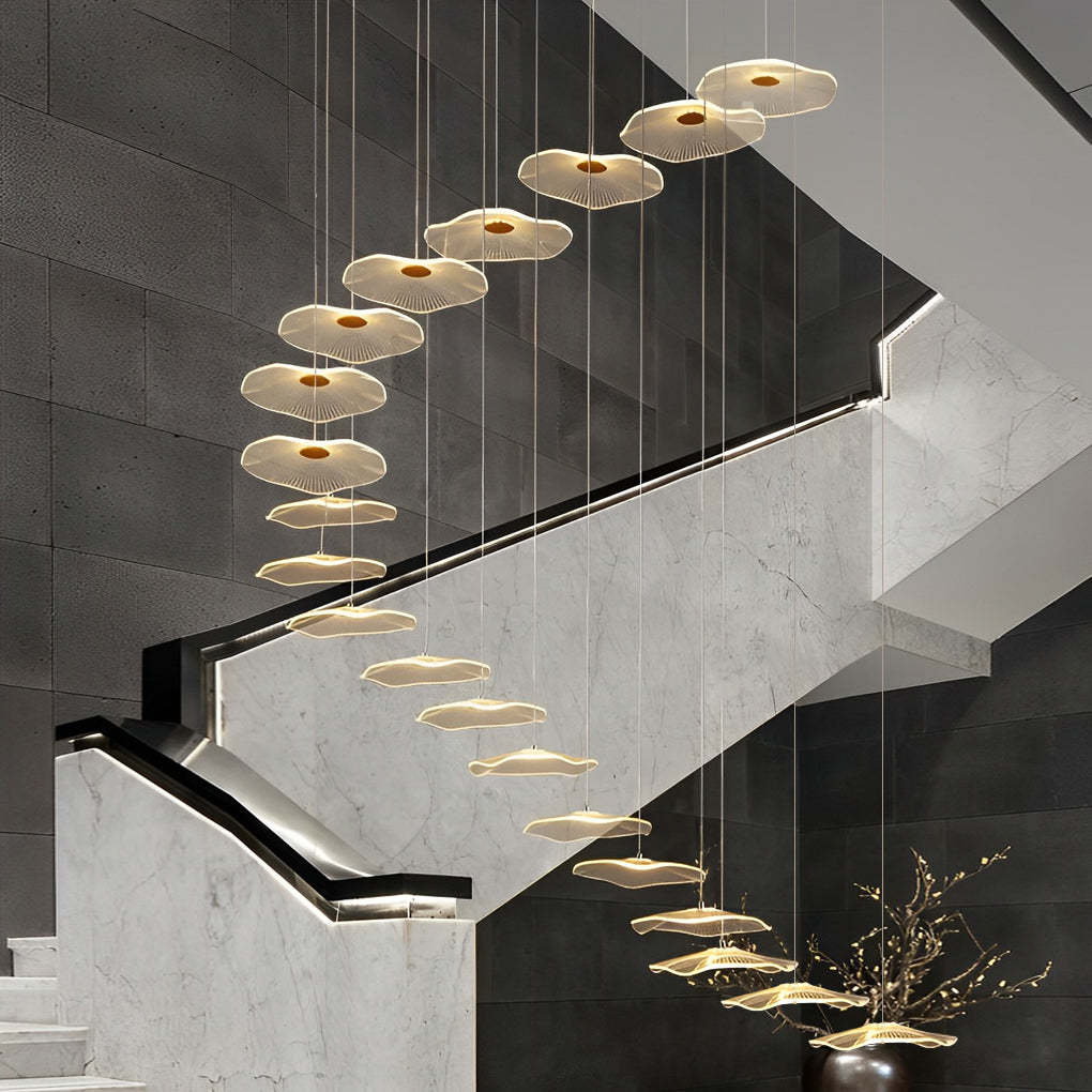 - These acrylic lampshades of the long staircase chandelier is designed in lotus leaves shape, which is exquisite and unique. Moreover, these acrylic lampshades transmit bright and uniform light, which can create a warm and comfortable atmosphere for your interior space.
