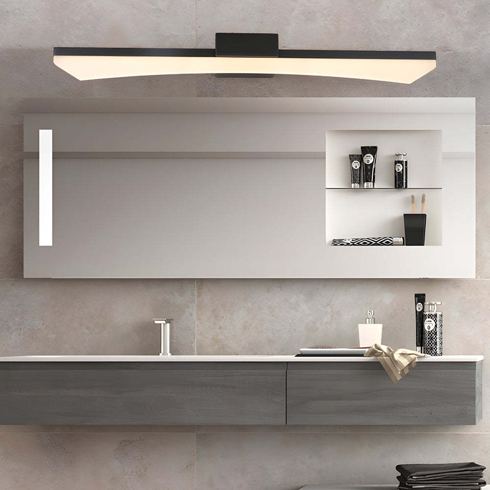 - Crafted with high-quality steel and acrylic, this curved linear LED vanity light combines sleek modern aesthetics with functional brilliance.