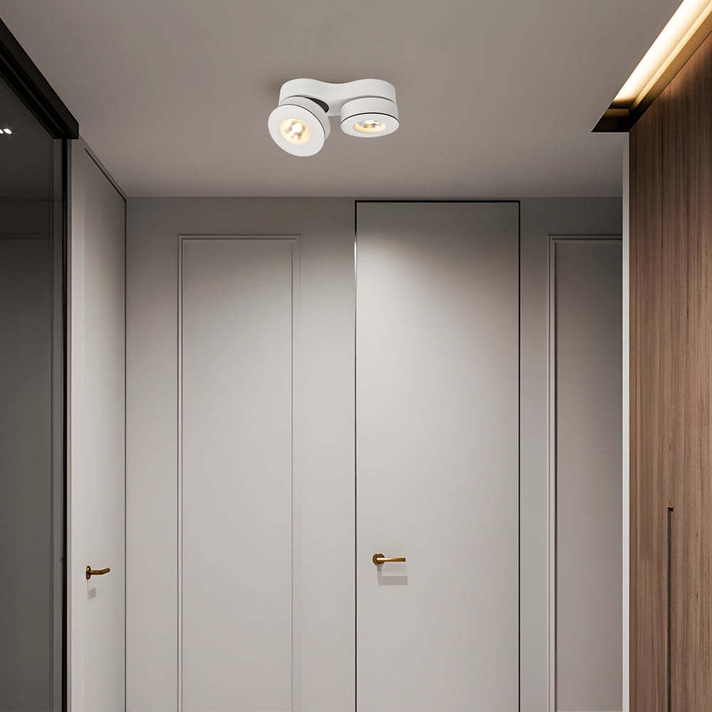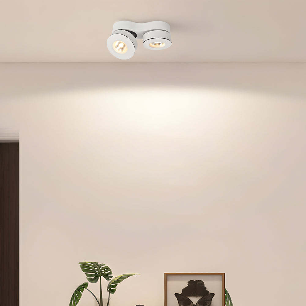- Our Double Head Rotating Folding Ceiling Spotlight is crafted from sleek metal, this ceiling-mounted fixture features two adjustable light heads, allowing you to pivot and fold them to your desired angle for great illumination. These spotlights are available in classic black or white finishes, making them easy to blend into any interior.