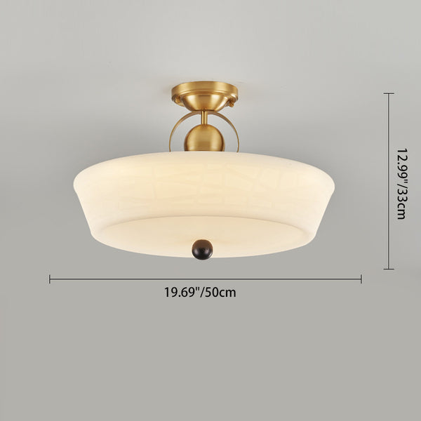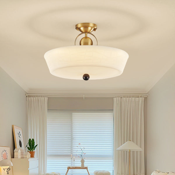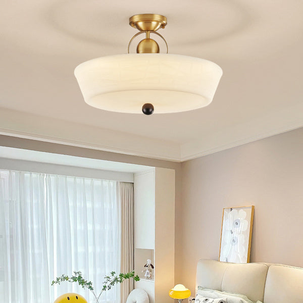 Elevate your living room with this French Mid-Century Semi-Flush Mount Light. featuring a stunning combination of brass. stainless steel. and acrylic materials. Its white gold color and round dome design provide a simple yet artistic appeal.