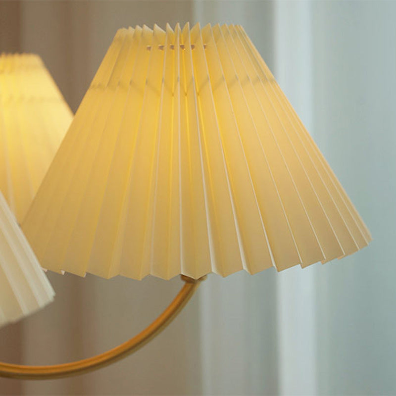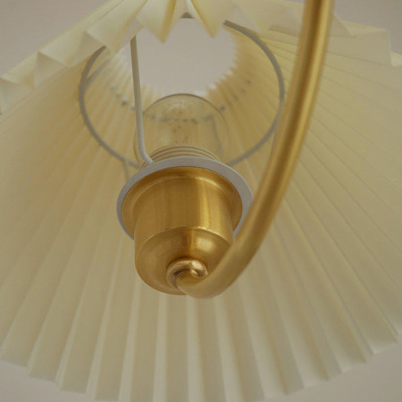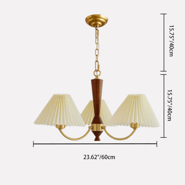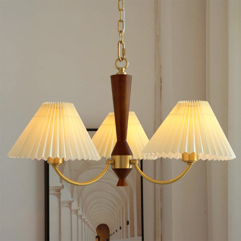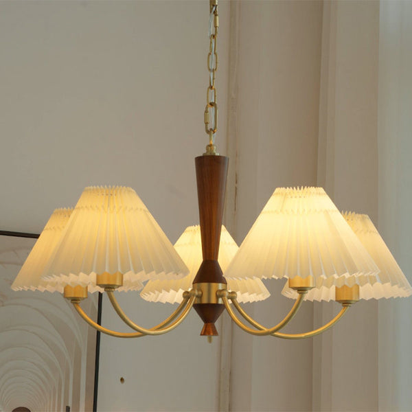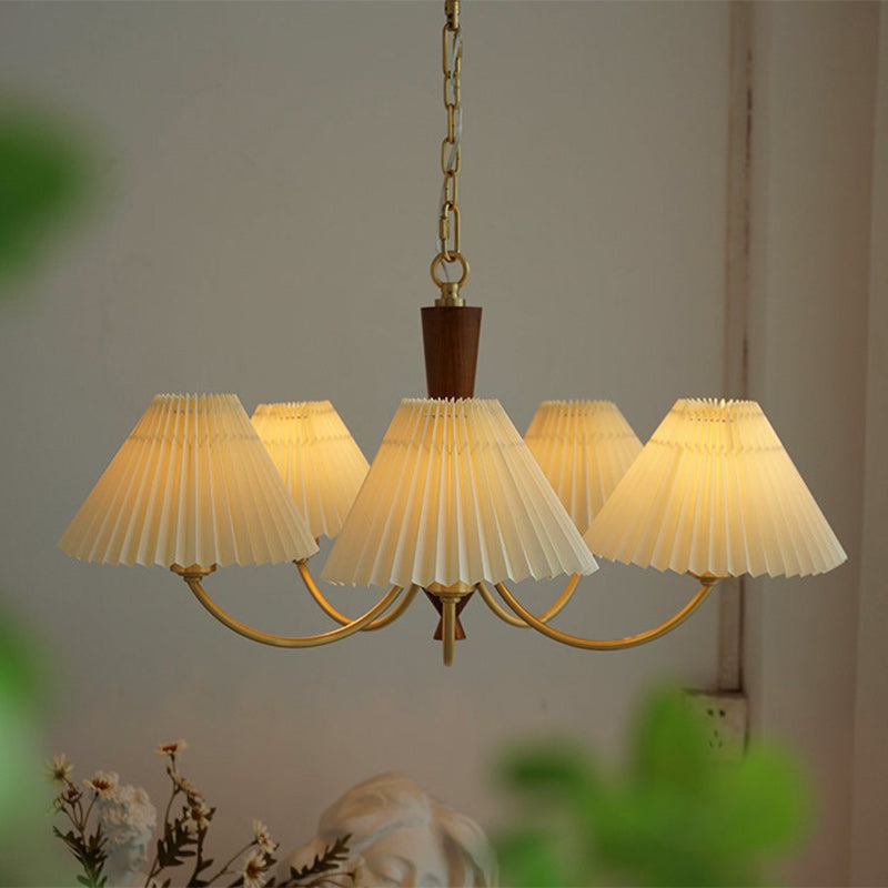 Featuring a creative pleated skirt design and elegant branch-shaped arms. this modern mid-century chandelier is crafted from brass. wood. and PVC in white and gold tones. Its adjustable hanging chain makes it perfect for customizing the ambiance in your living room.