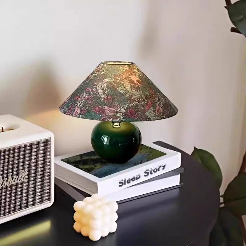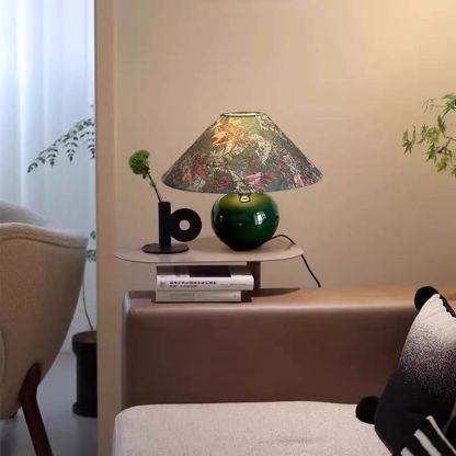 Add artistic charm to your living space with this green ceramic table lamp featuring a round globe base and patterned fabric shade. A perfect blend of function and d��cor. this 1-light lamp doubles as a decorative accent piece for modern or mid-century interiors.