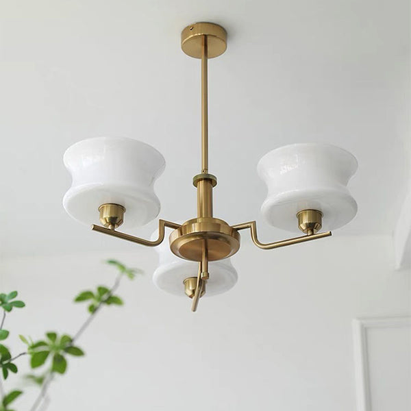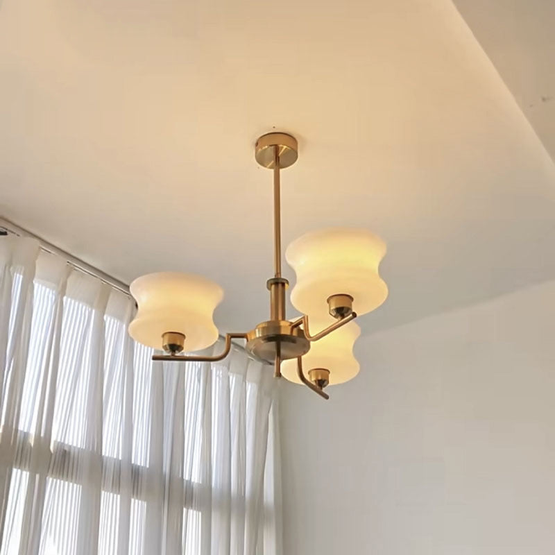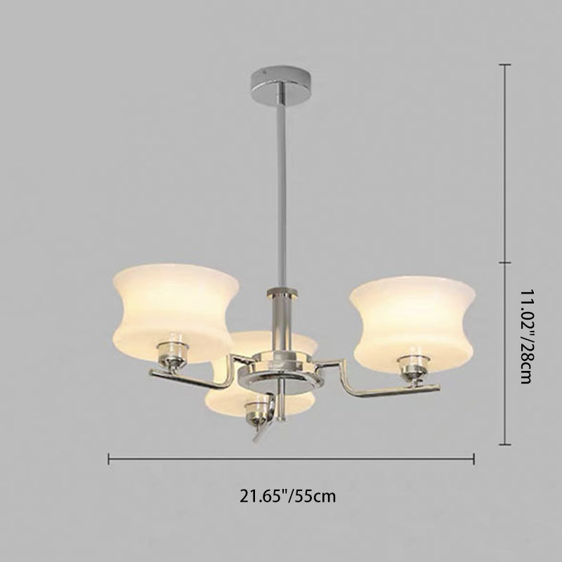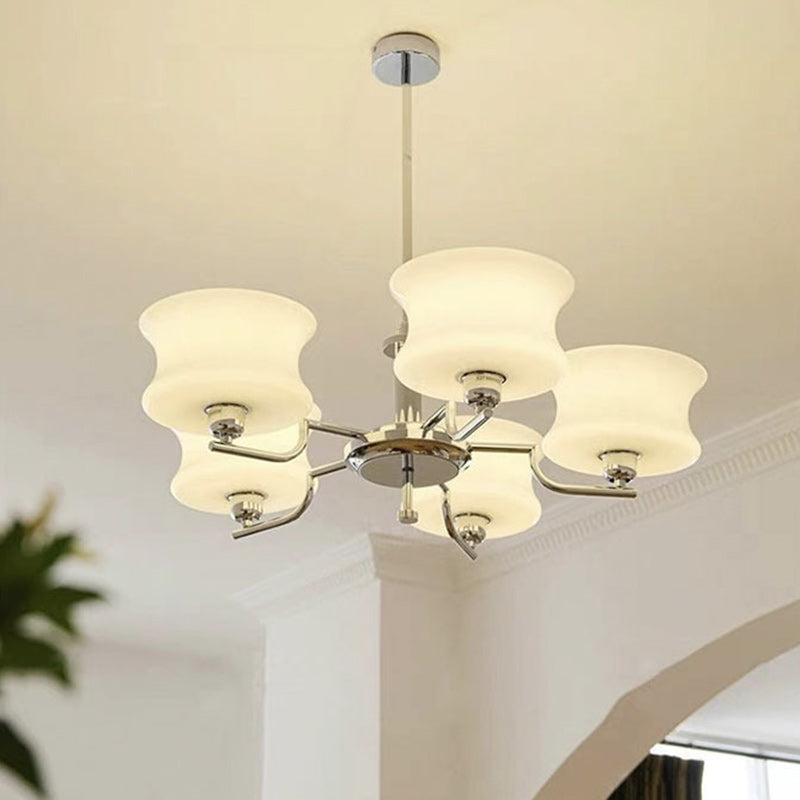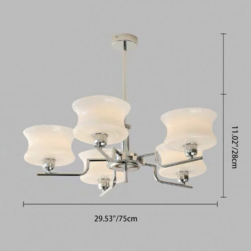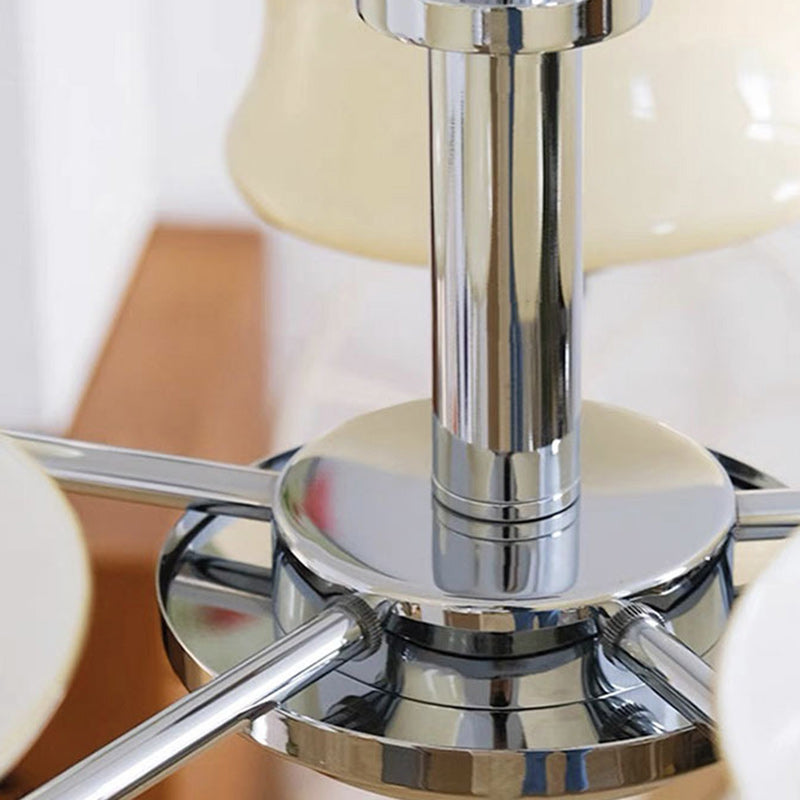 Showcasing a modern mid-century design. this round chandelier features high-transparency glass and chrome or gold metal accents with milky yellow and white lampshades. Perfect for bedrooms and living rooms. it delivers a stylish glow with vintage character.