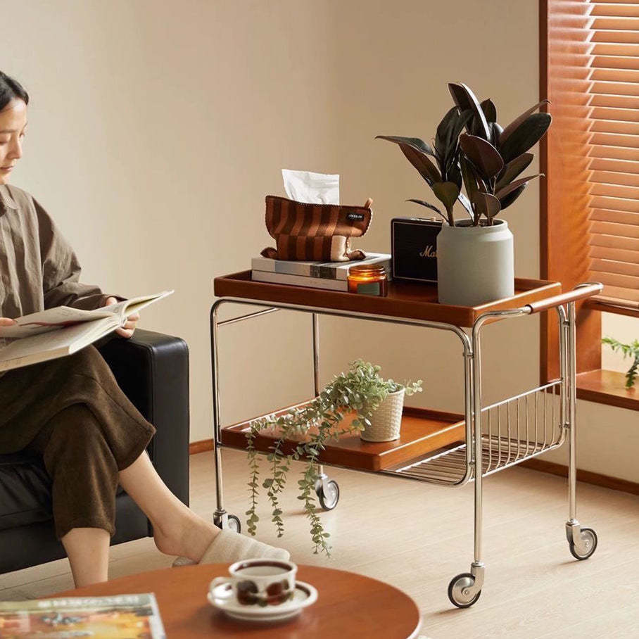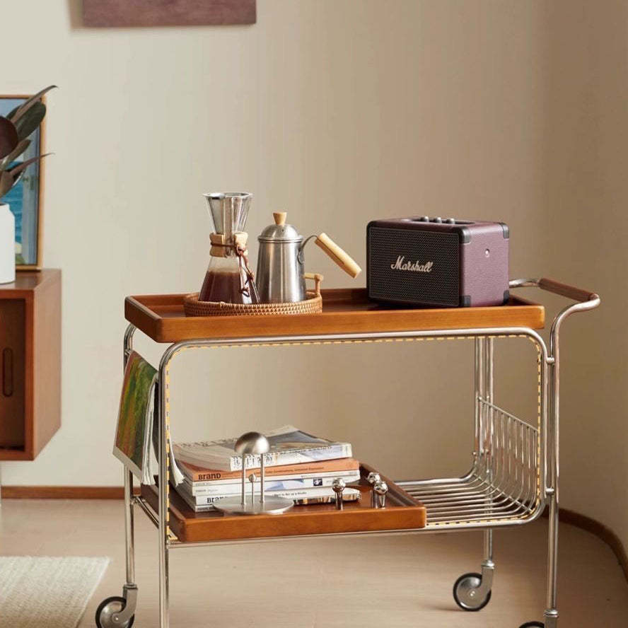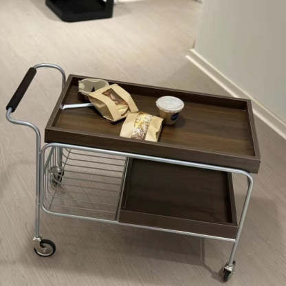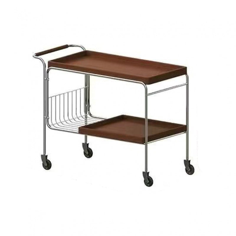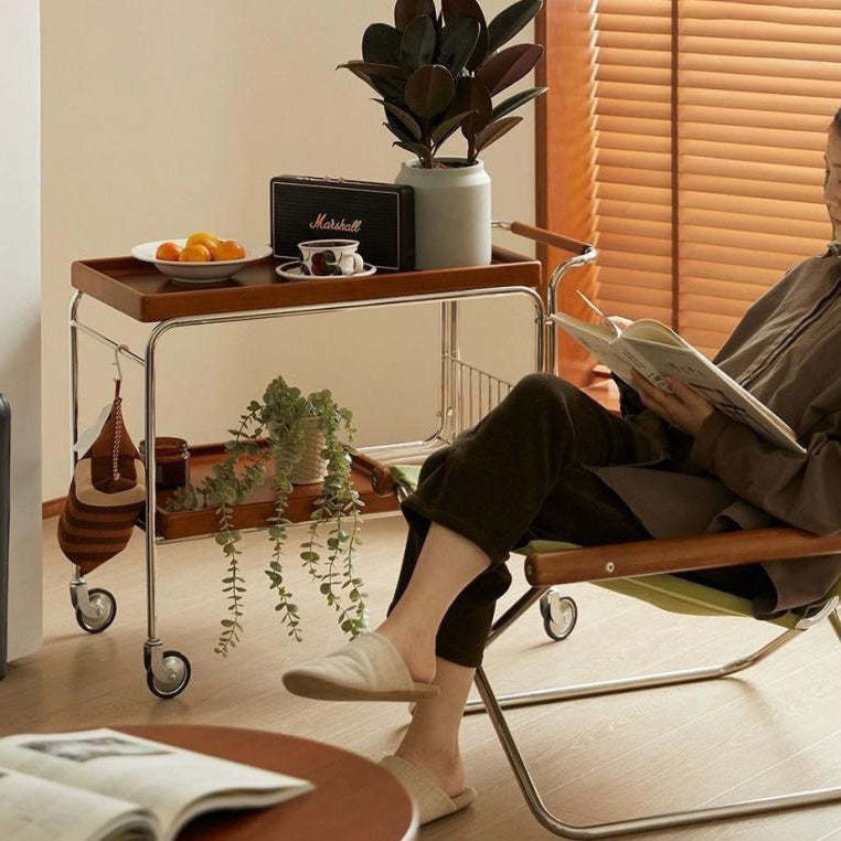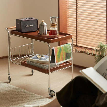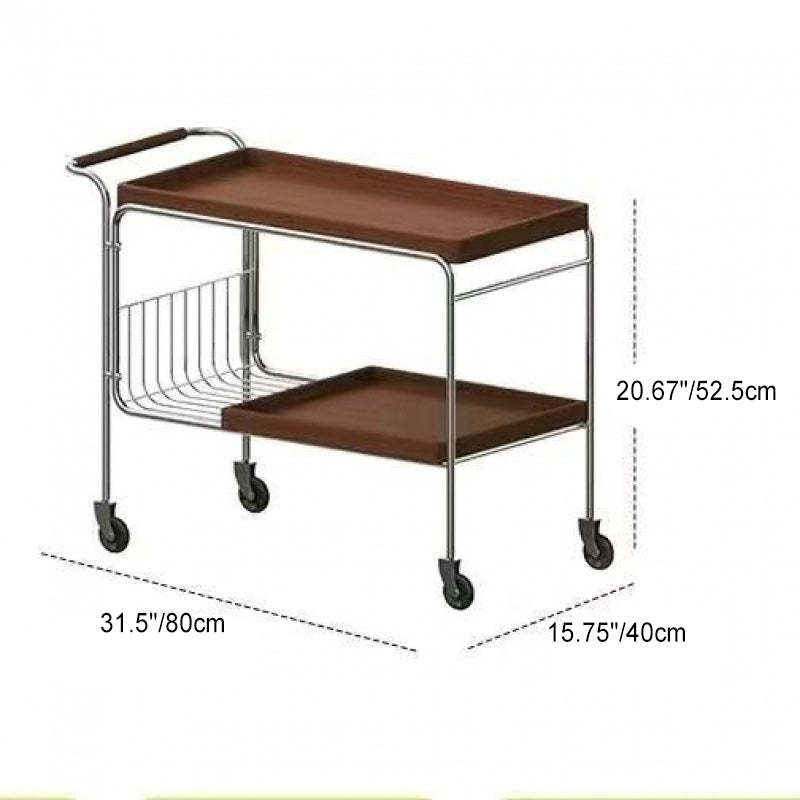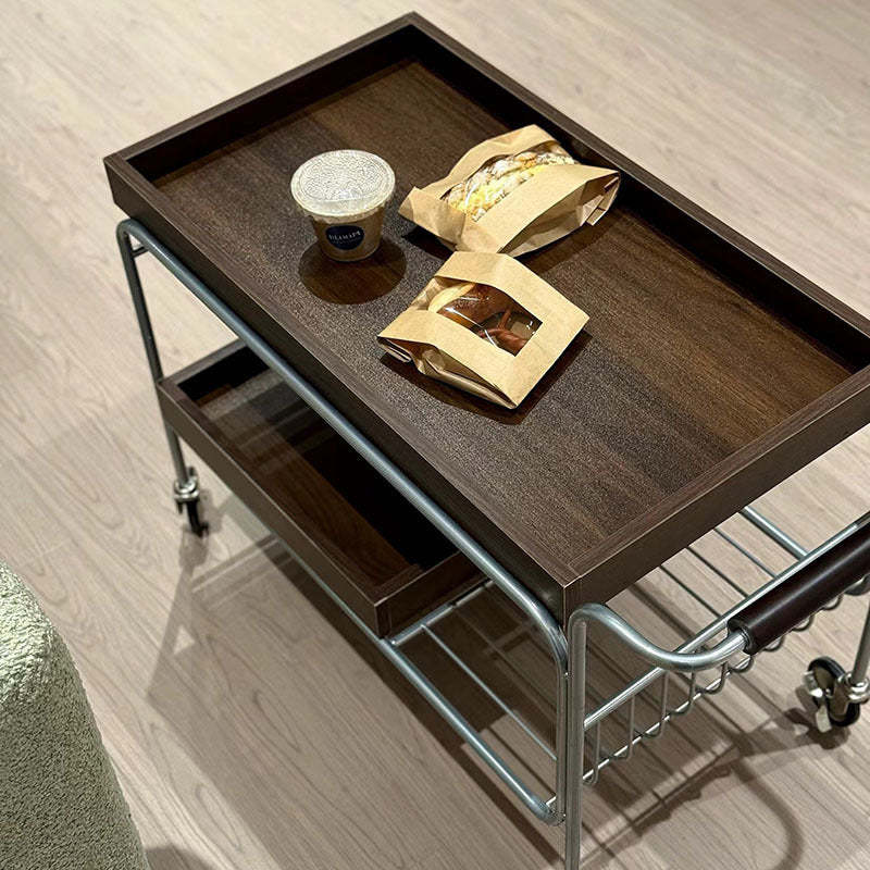 Modern Mid-Century Rectangular Trolley Metal Wood Plate Side Table 2-Tier Movable For Living Room