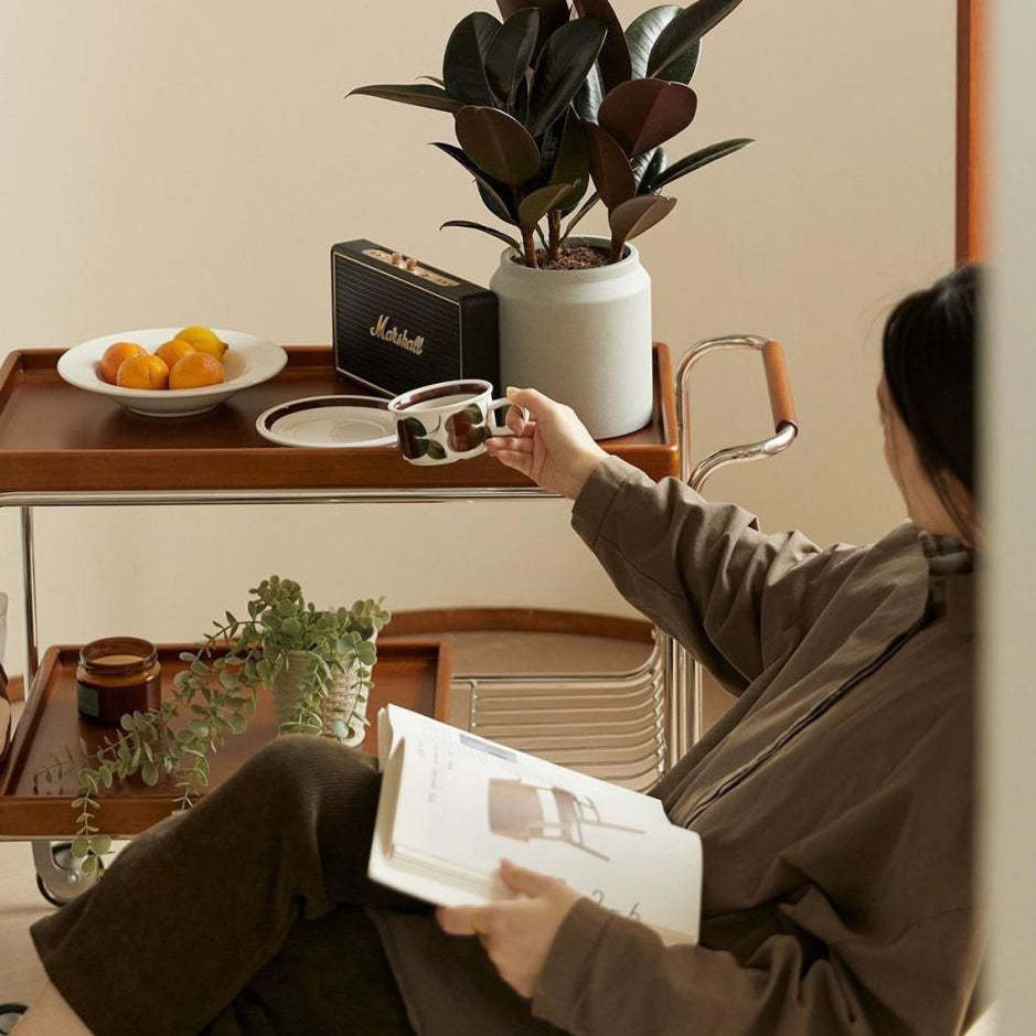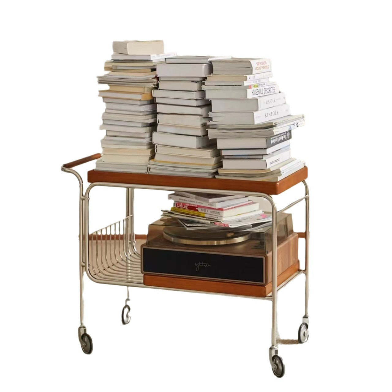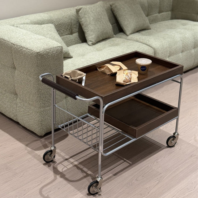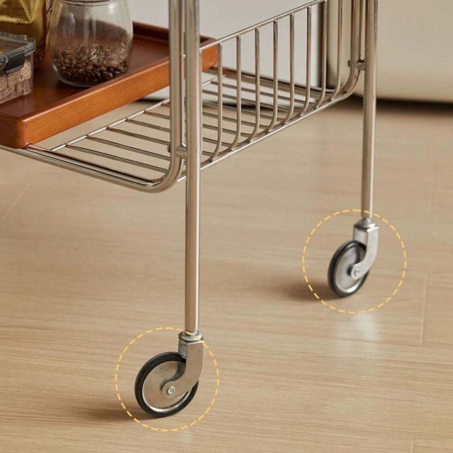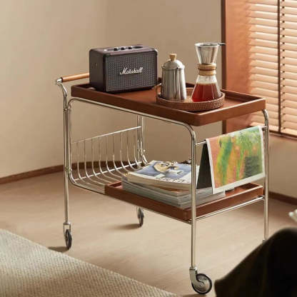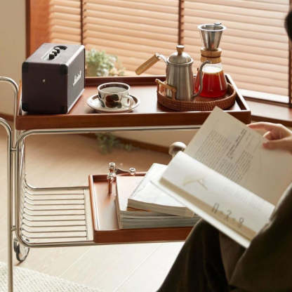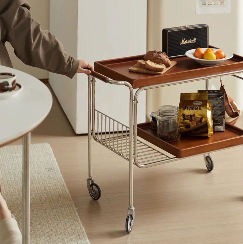 Modern Mid-Century Rectangular Trolley Metal Wood Plate Side Table 2-Tier Movable For Living Room