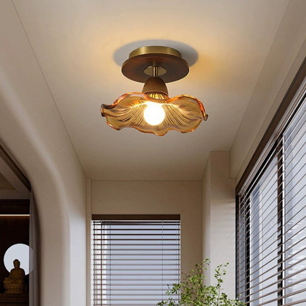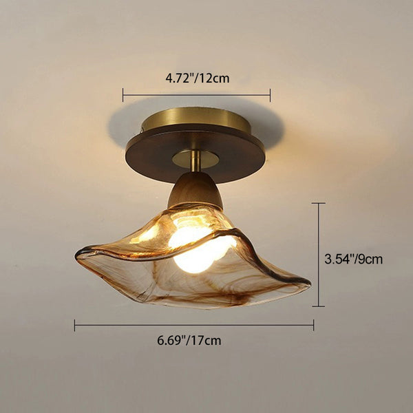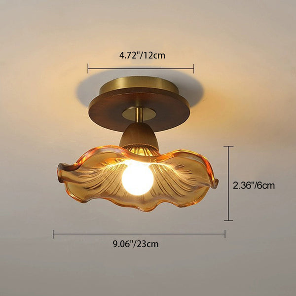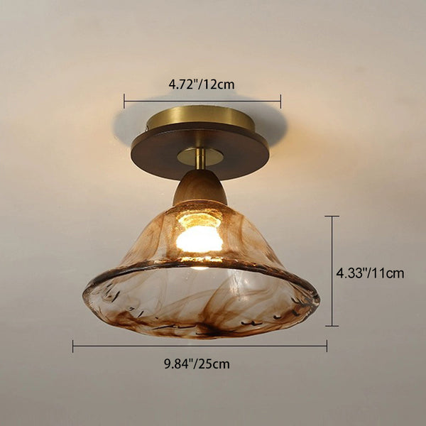 Modern Mid-Century Round Quadrilateral Lace Rubber Wood Iron Glass 1-Light Semi-Flush Mount Ceiling Light For Living Room