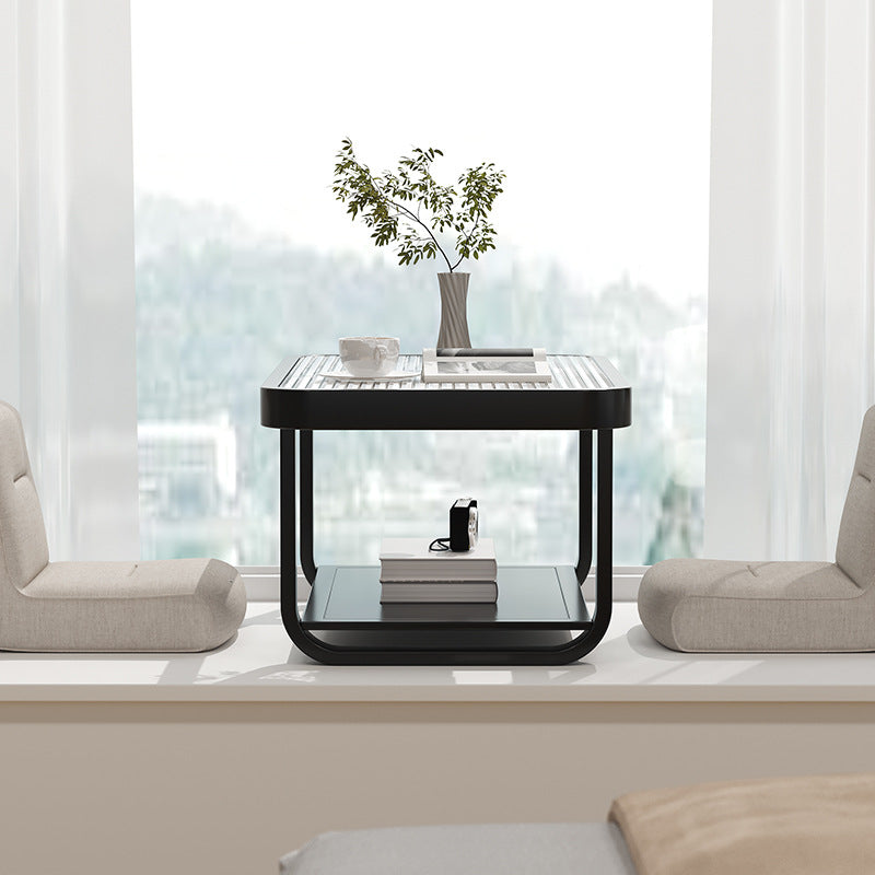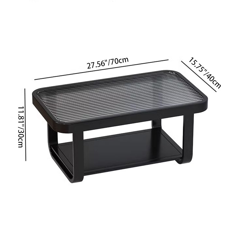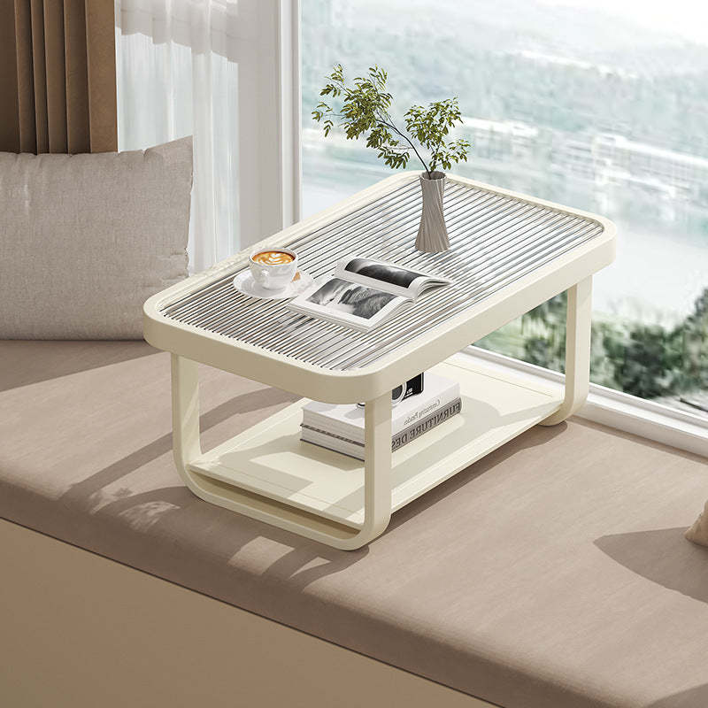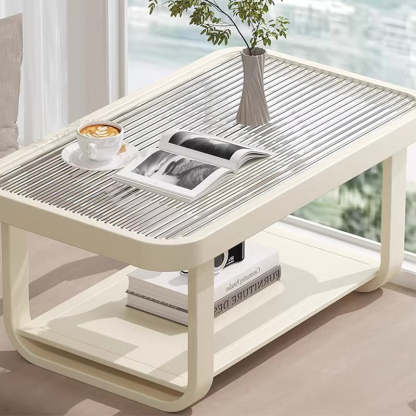 This modern minimalist rectangular coffee table features a sleek 2-tier design with a sturdy metal frame and glass tabletop. Available in black or white. with options for striped. clear. or tea color glass. it adds functional elegance and style to any contemporary living room setting.
