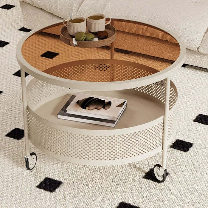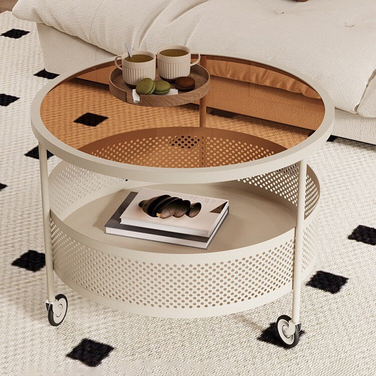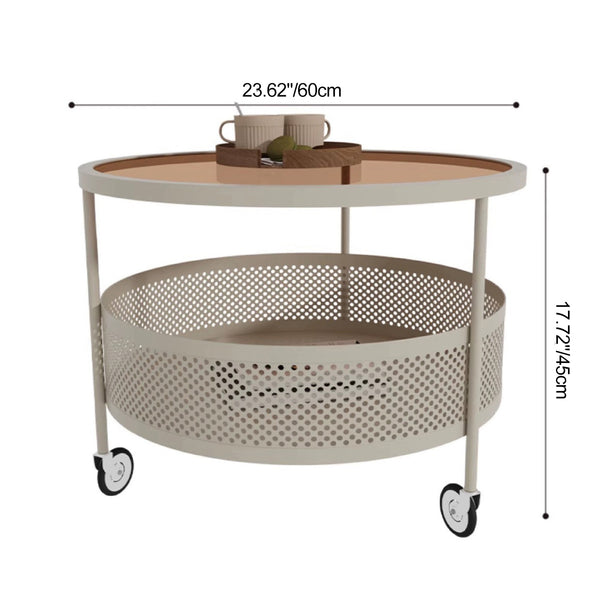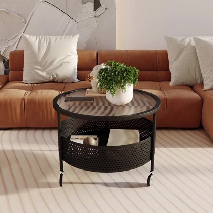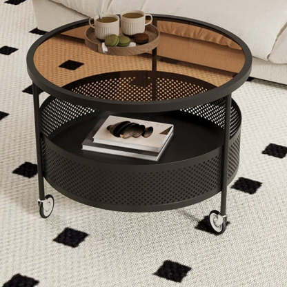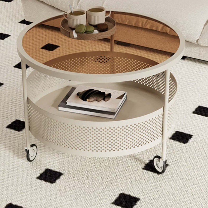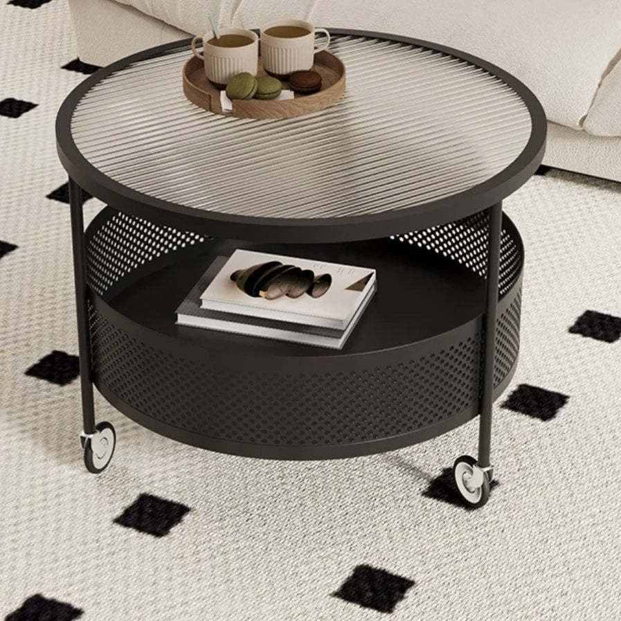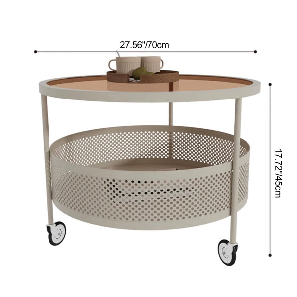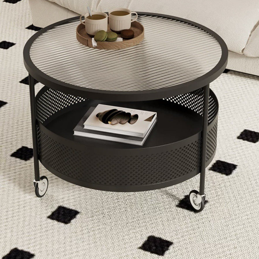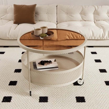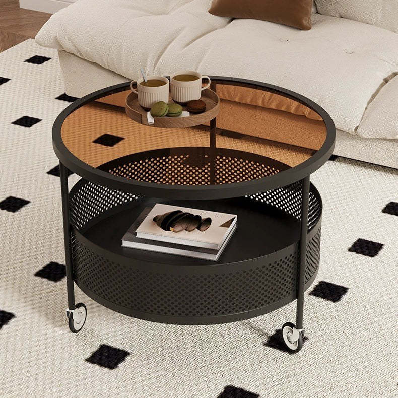 Modern Minimalist Glass & Metal Round Coffee Table With 1-Storage & Wheels For Living Room
