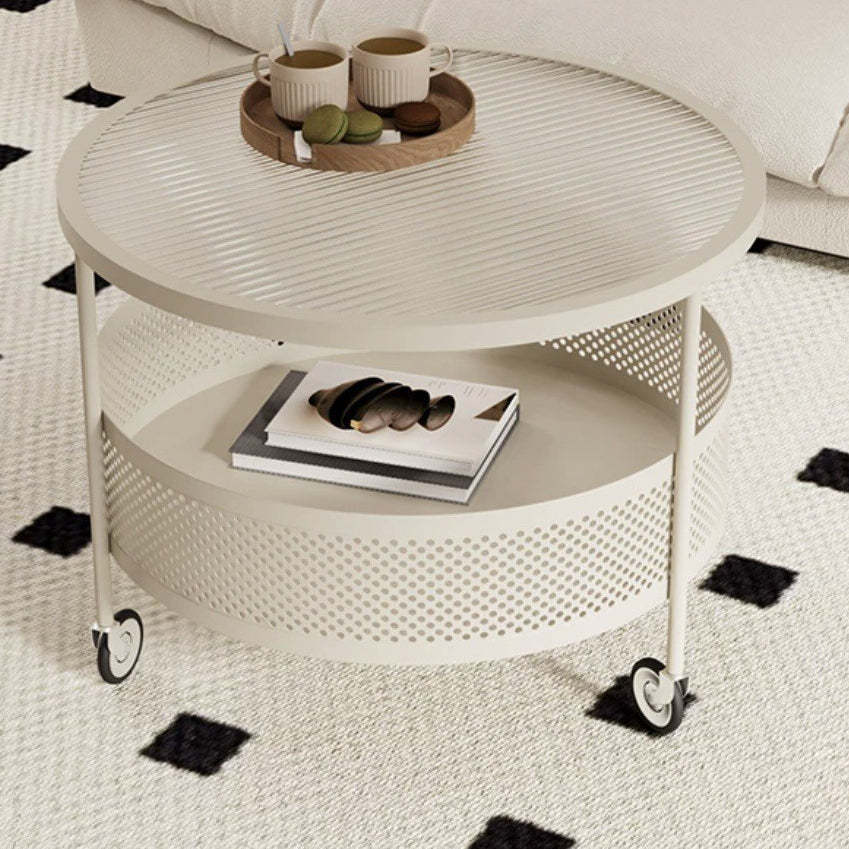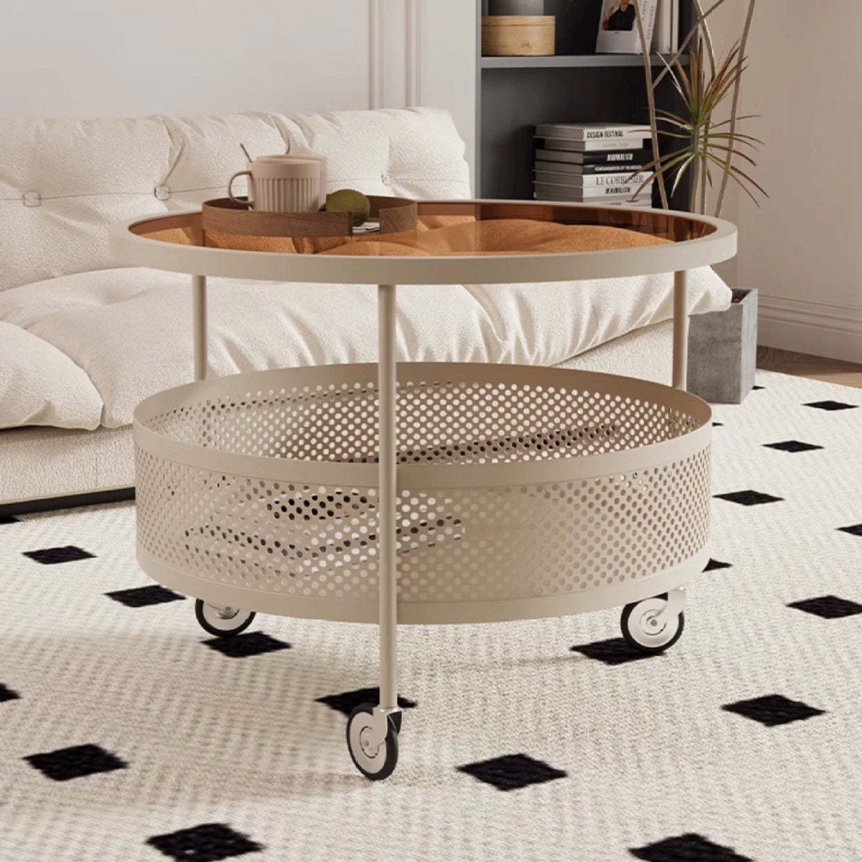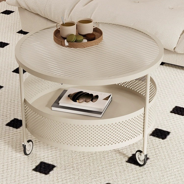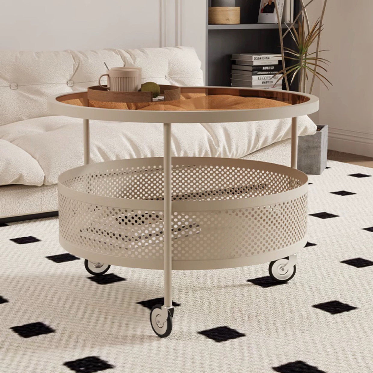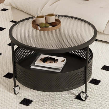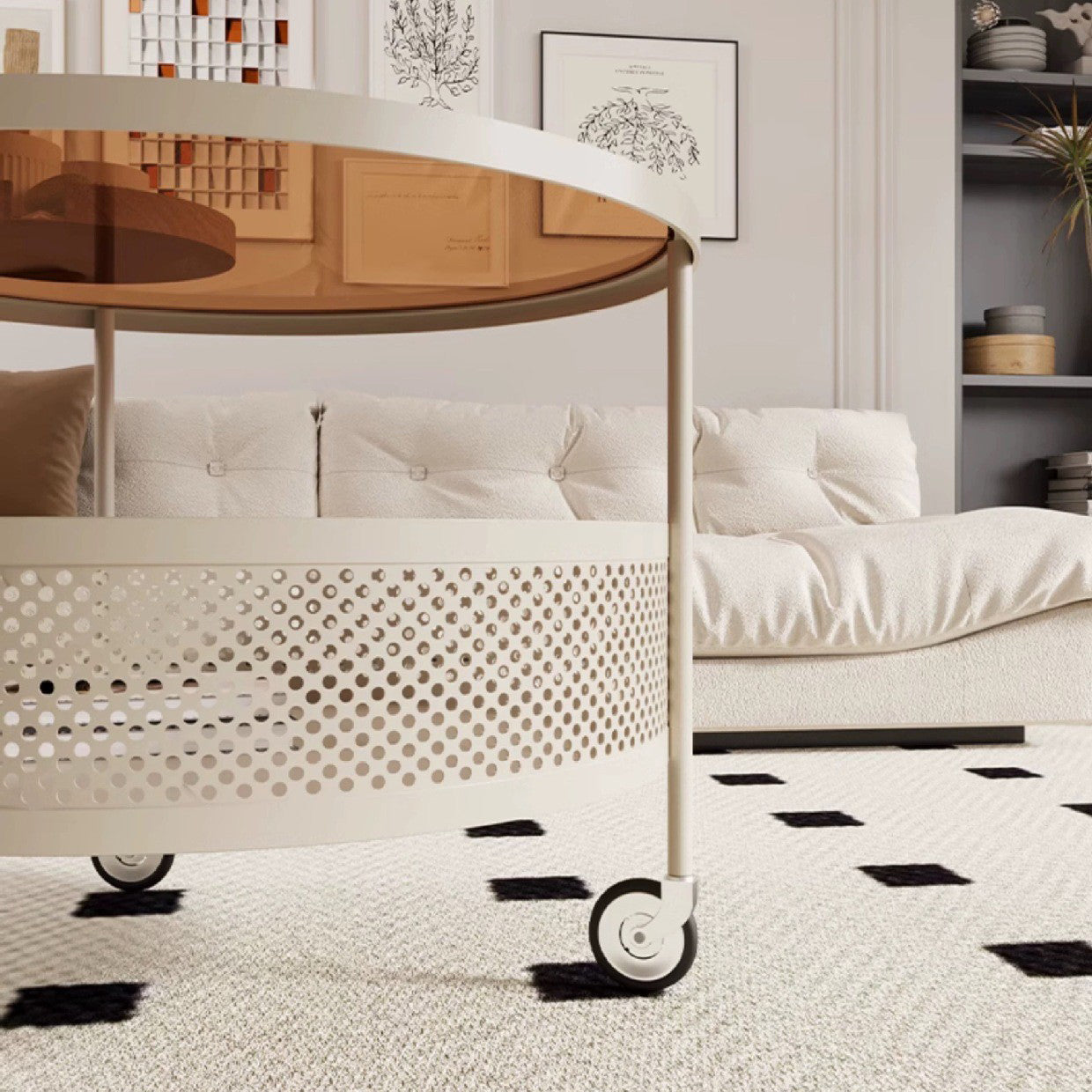 Modern Minimalist Glass & Metal Round Coffee Table With 1-Storage & Wheels For Living Room