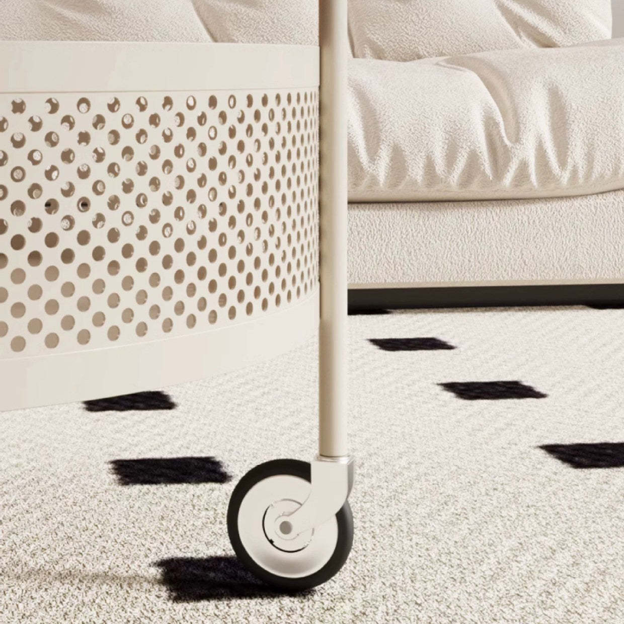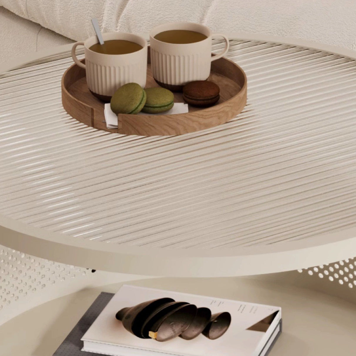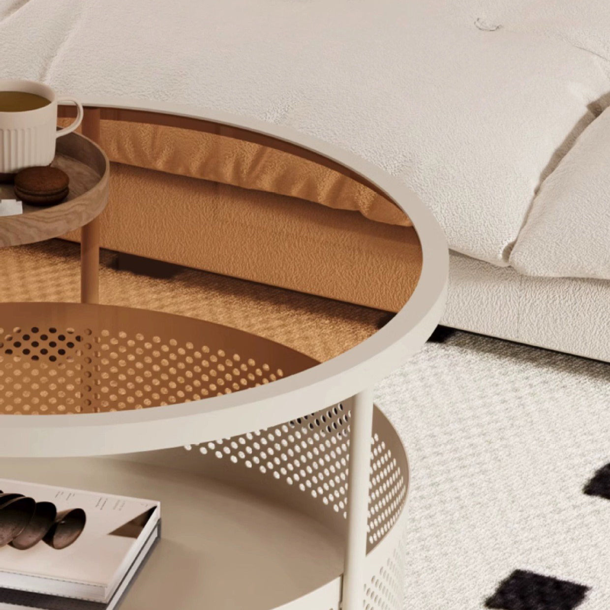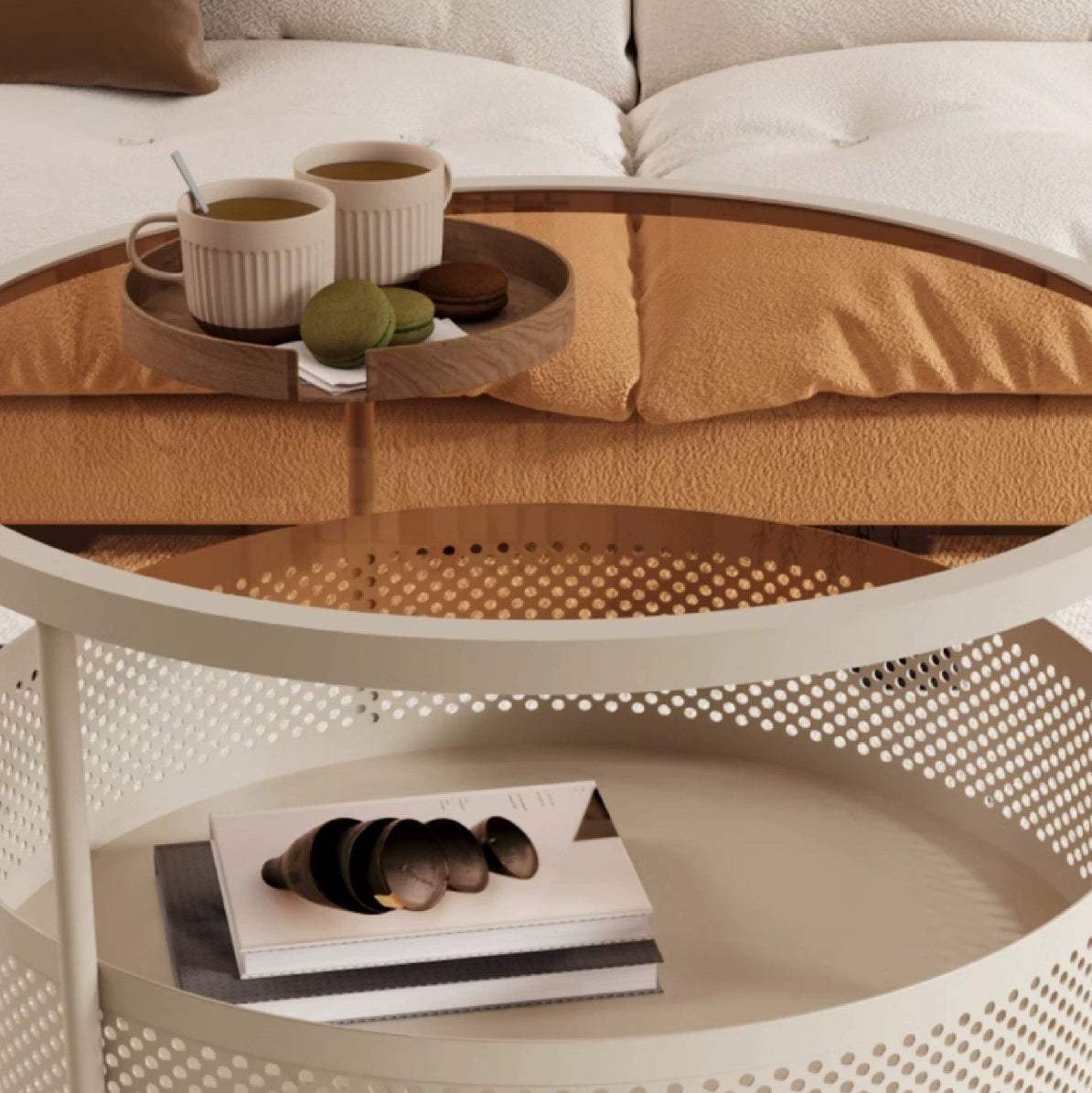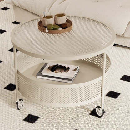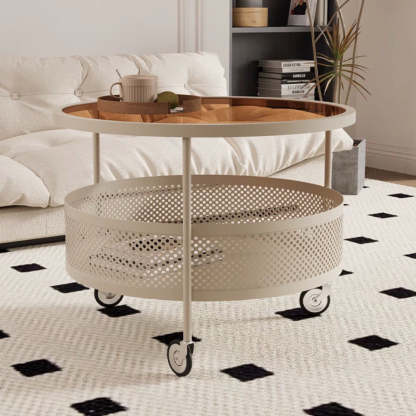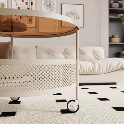 This modern minimalist round coffee table features a durable tempered glass top and a sturdy metal frame. Designed for convenience. it includes a storage shelf and smooth-rolling caster wheels for easy mobility. Available in elegant off-white and black. it's a stylish and functional addition to any living room.