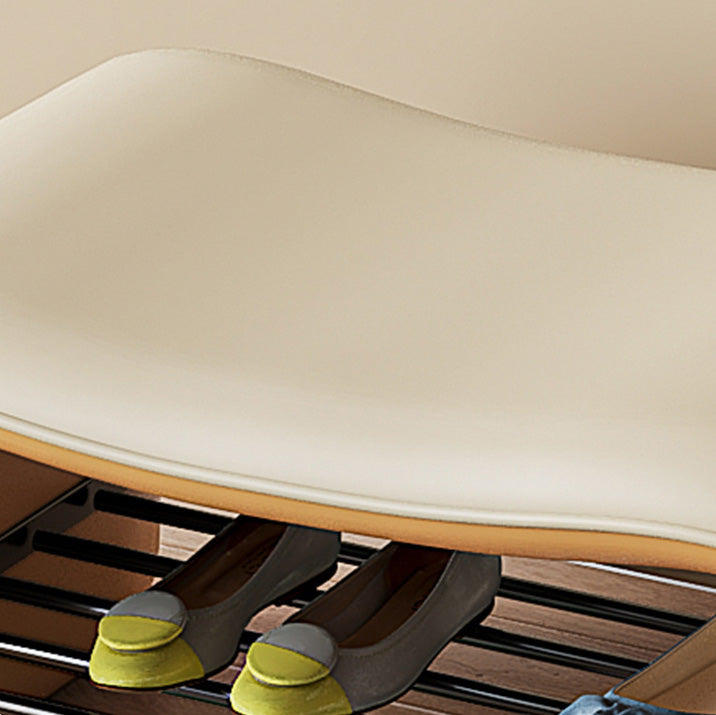 Upgrade your entryway with this modern minimalist beige and gray shoe bench. featuring a unique wavy rectangular leather seat and a sturdy metal frame. Designed with a built-in rack for shoe storage. it's perfect for hallways. closets. or at the foot of your bed.