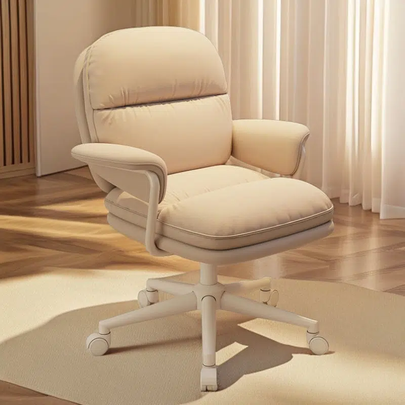 This sleek modern office chair features a soft PU leather square cushion. ergonomic backrest and armrests. and smooth-rolling caster wheels for easy mobility. Available in white. gray. light brown. and almond beige??perfect for home offices seeking both comfort and style.