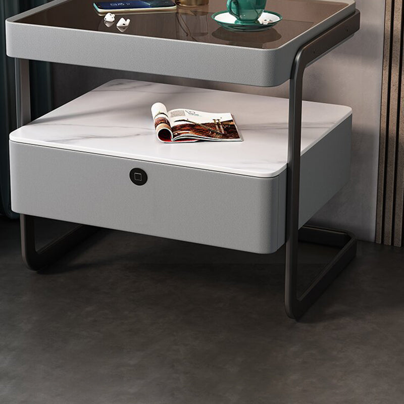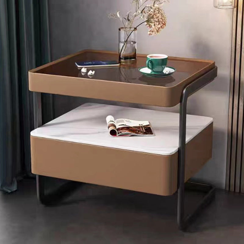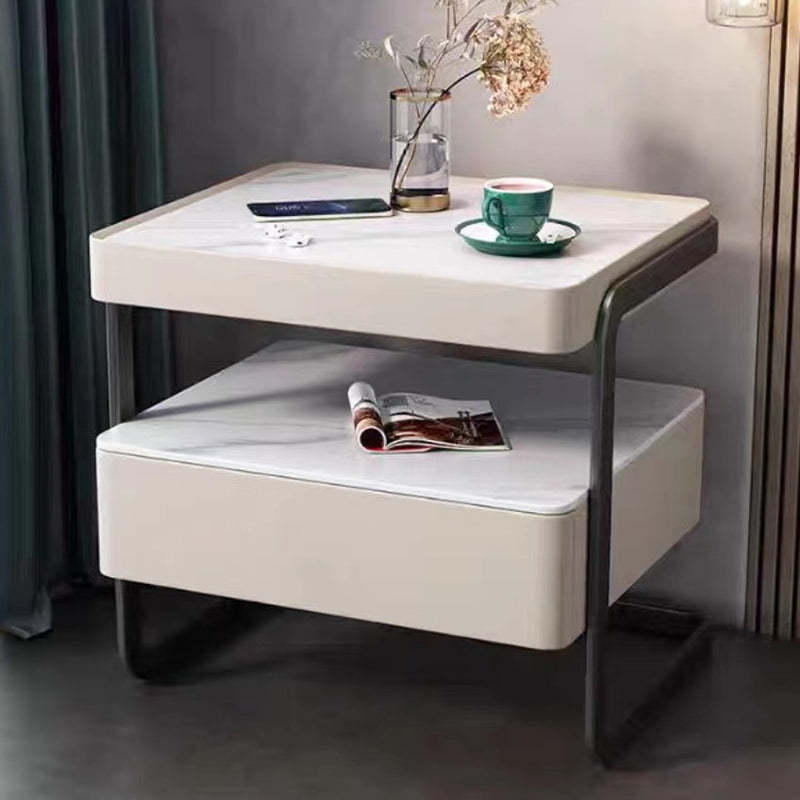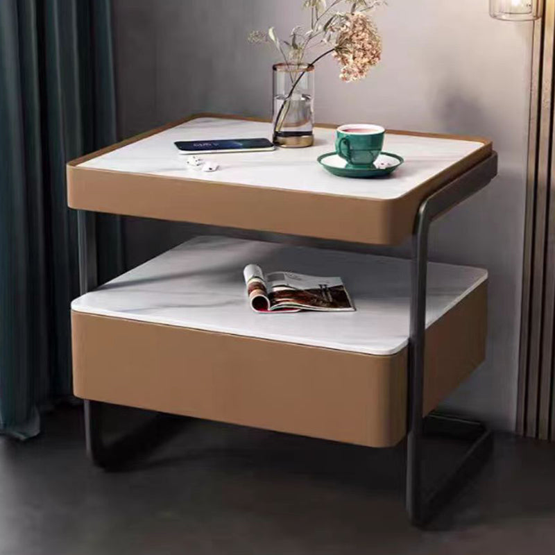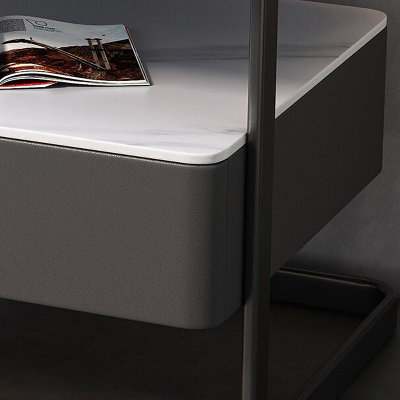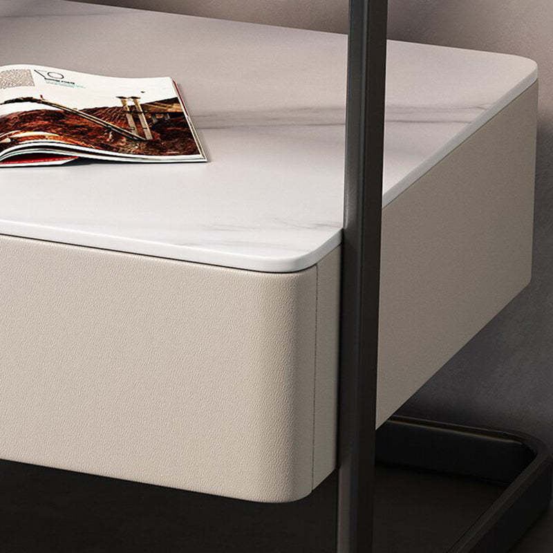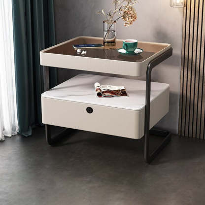 Modern Minimalist Rock Slab, Glass, PU Leather, Wood & Carbon Steel Rectangular Nightstand With 1-Drawer For Bedroom & Living Room