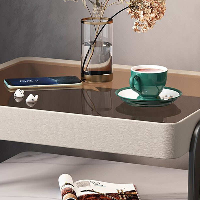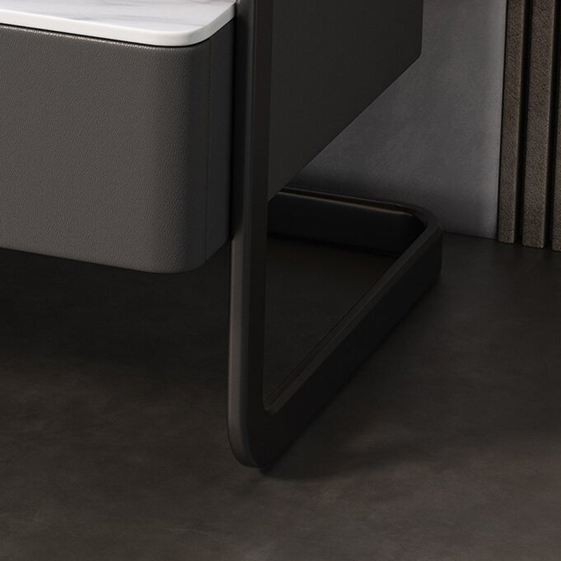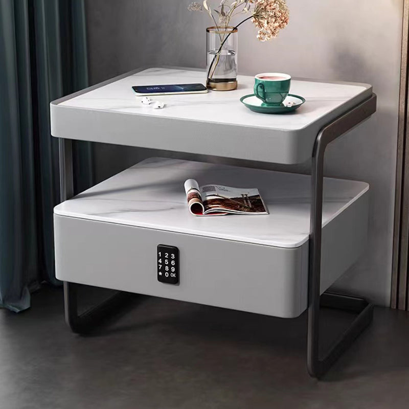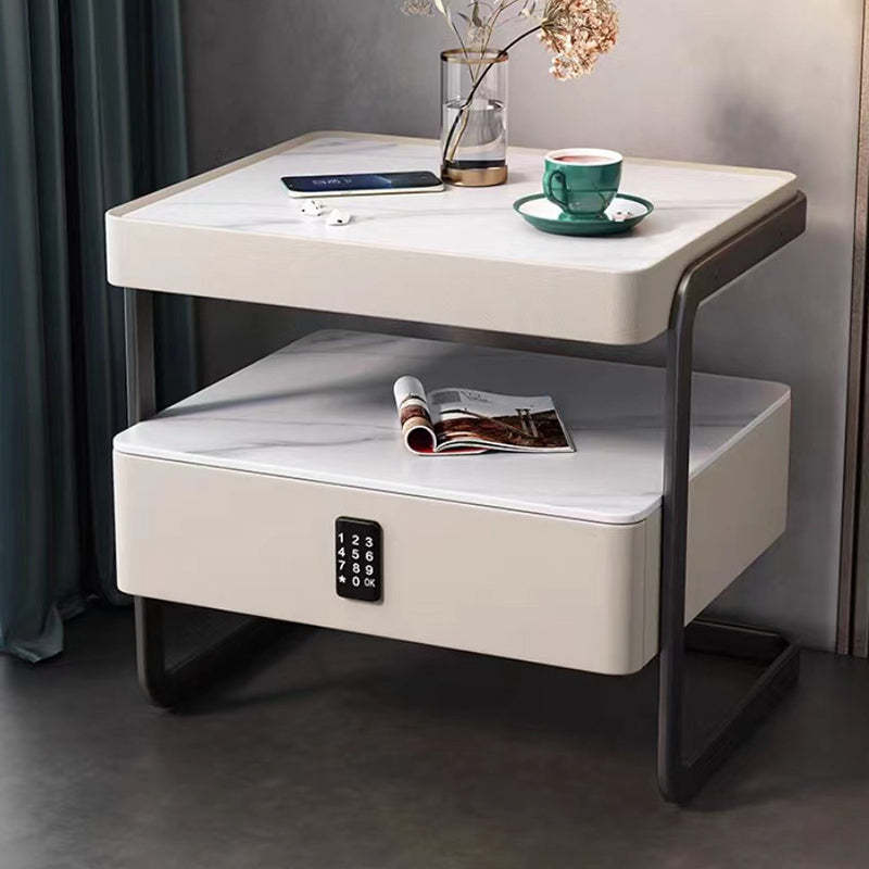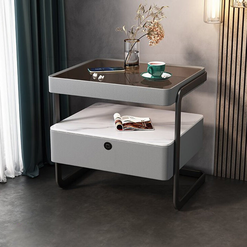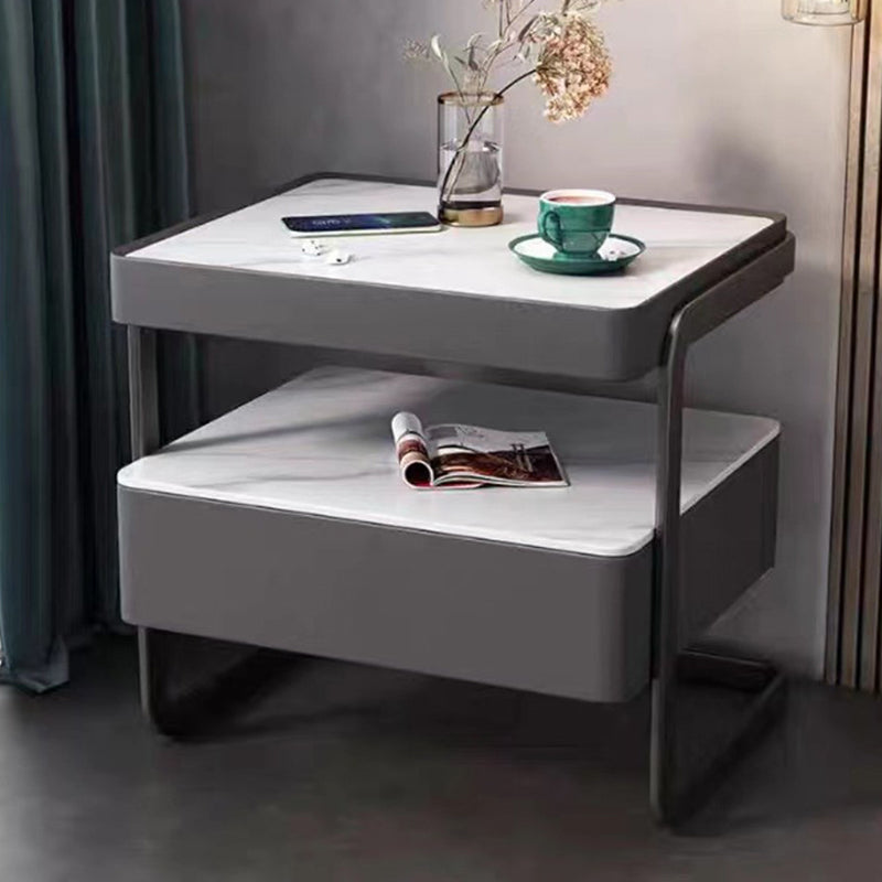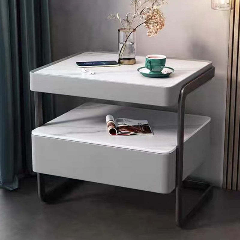 Modern Minimalist Rock Slab, Glass, PU Leather, Wood & Carbon Steel Rectangular Nightstand With 1-Drawer For Bedroom & Living Room