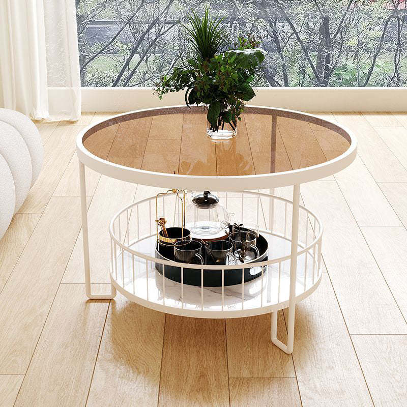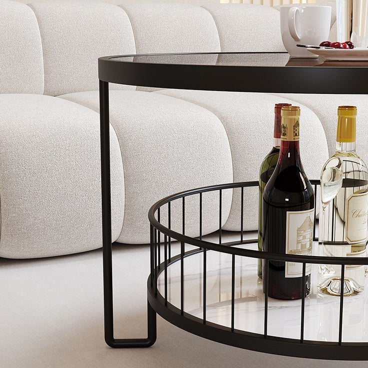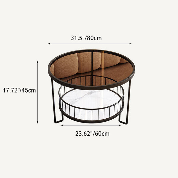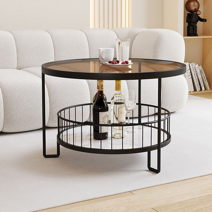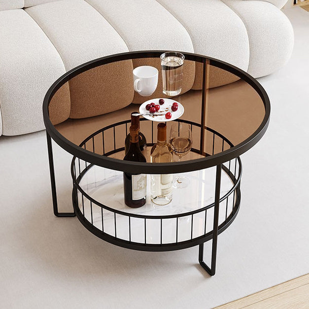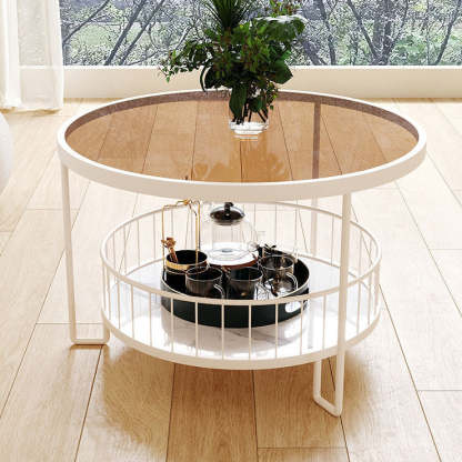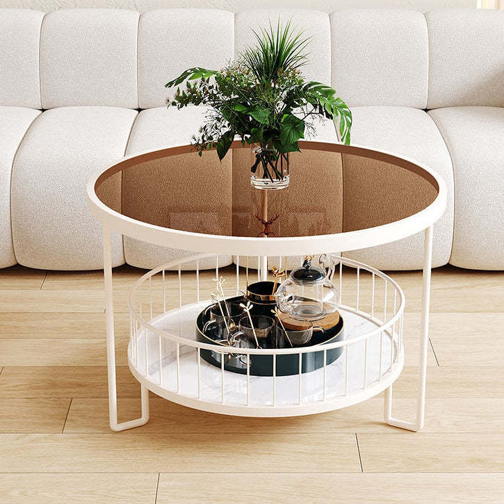 Modern Minimalist Round Tabletop Iron Tempered Glass Coffee Table 1-Shelf For Living Room