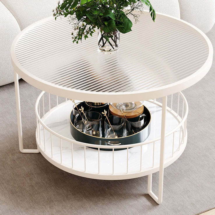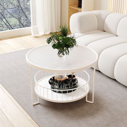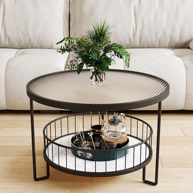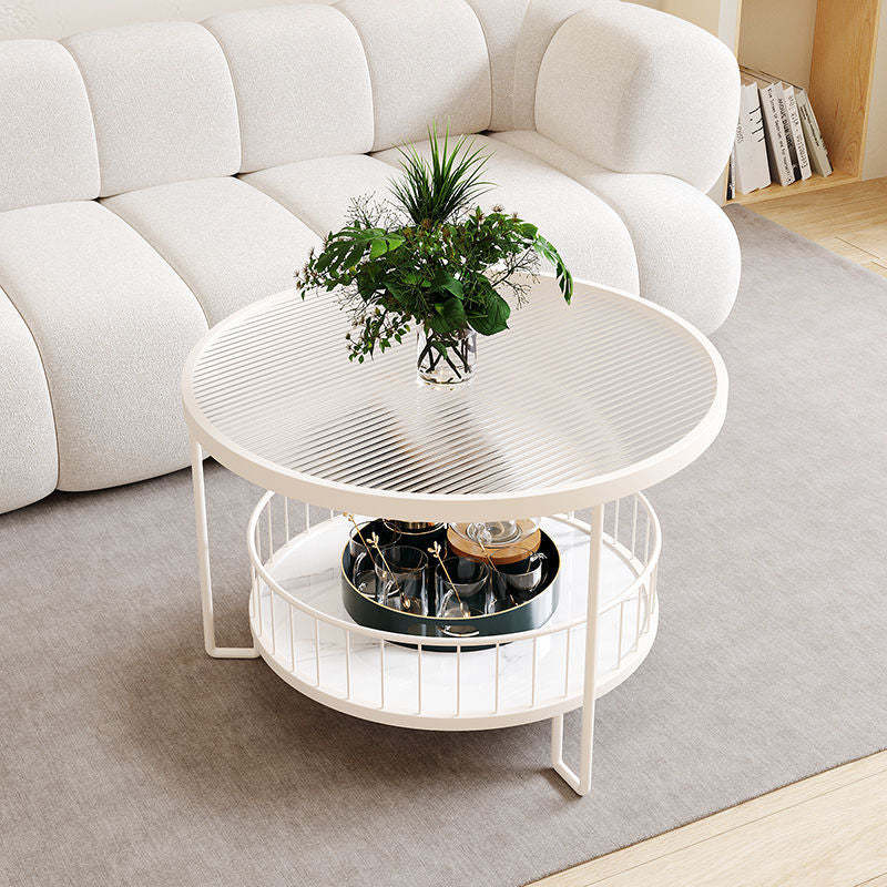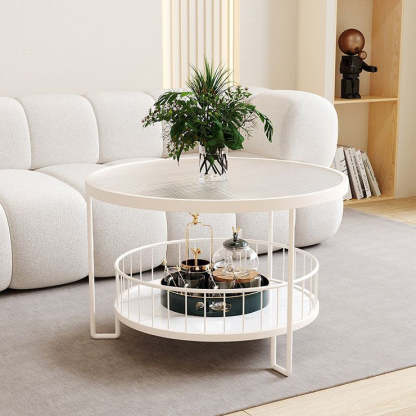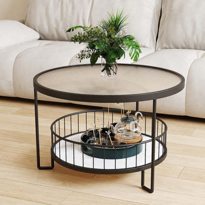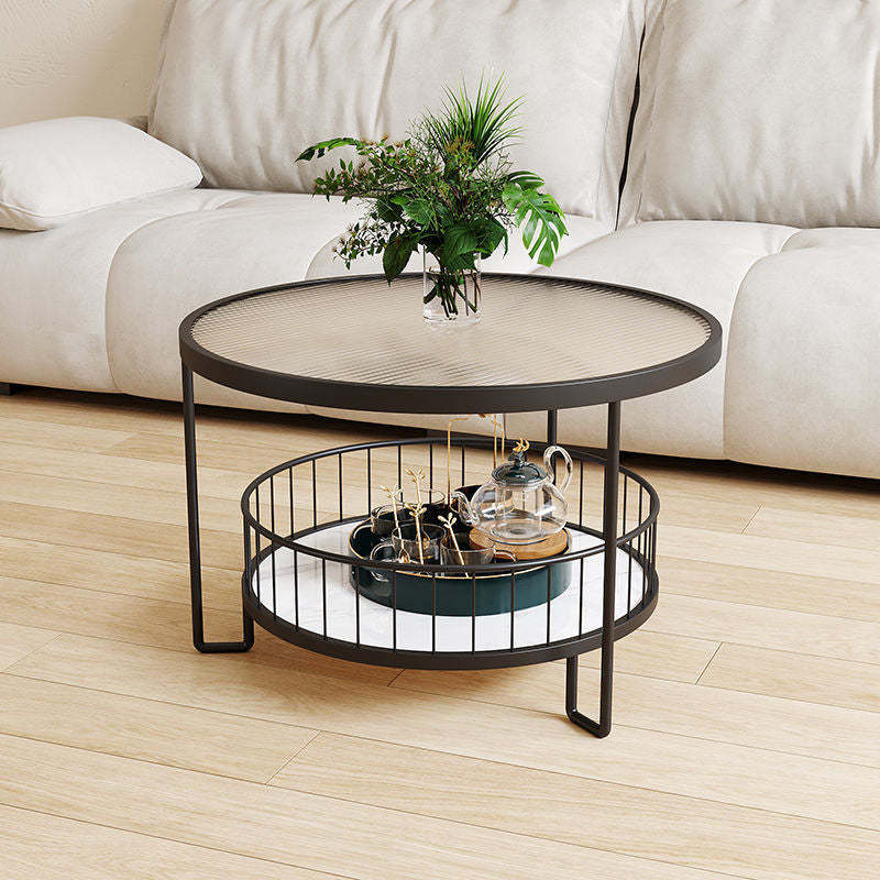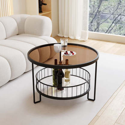 Modern Minimalist Round Tabletop Iron Tempered Glass Coffee Table 1-Shelf For Living Room