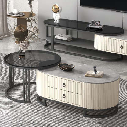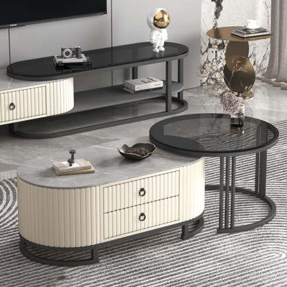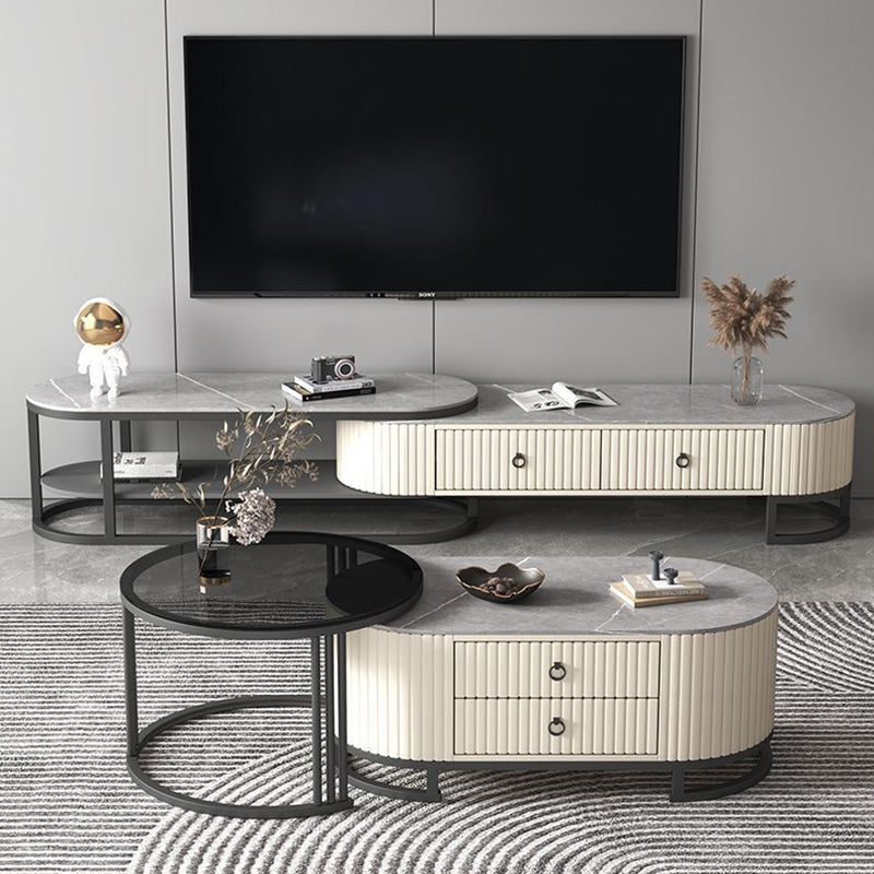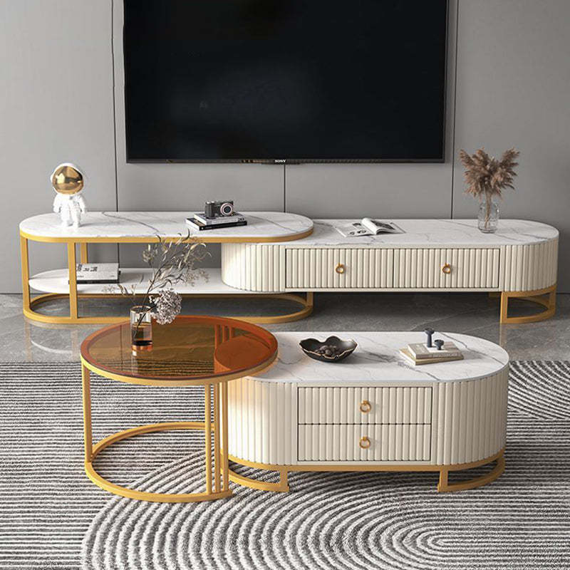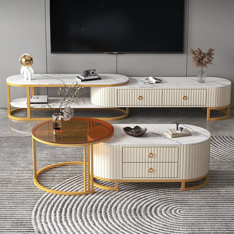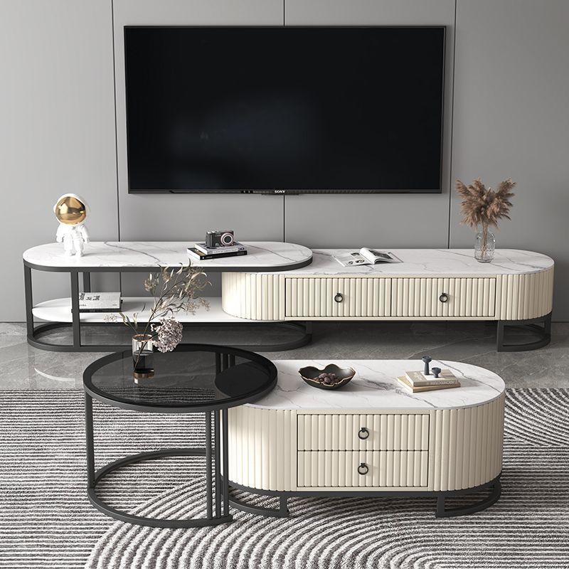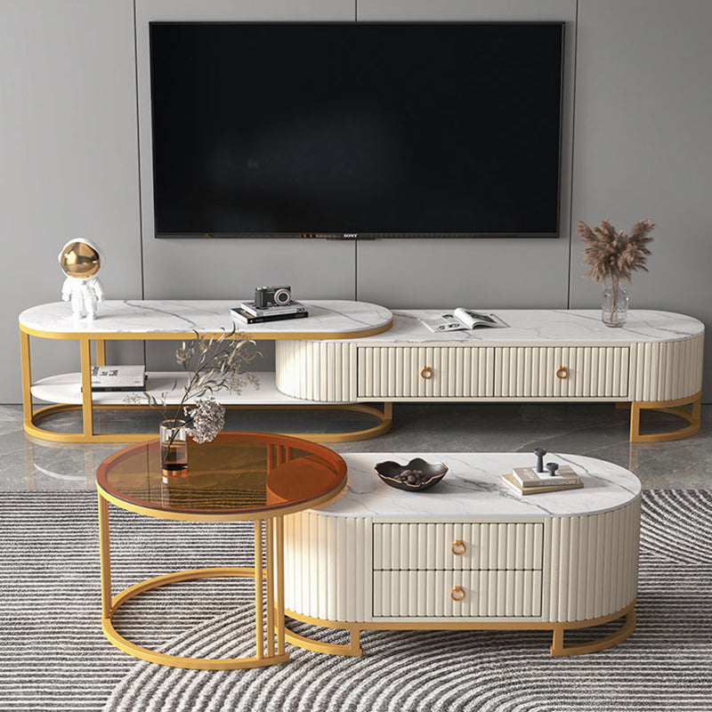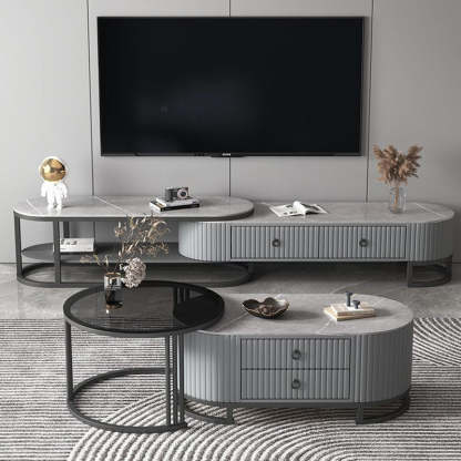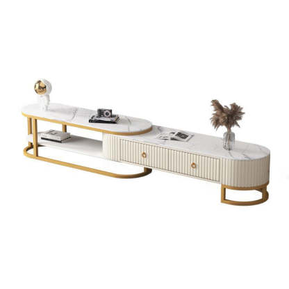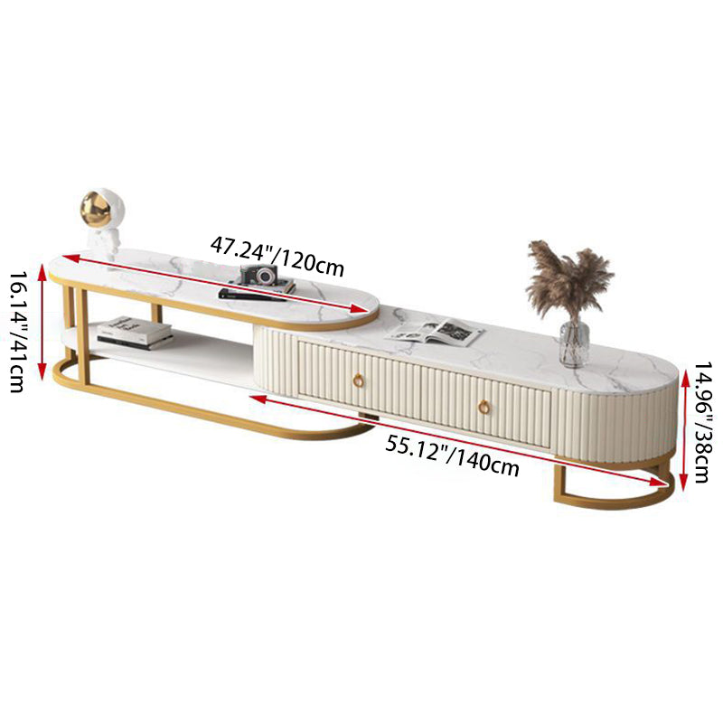 Modern Minimalist Slab Wood Leather Metal Elliptical TV Stand 2-Drawer Extendable For Living Room