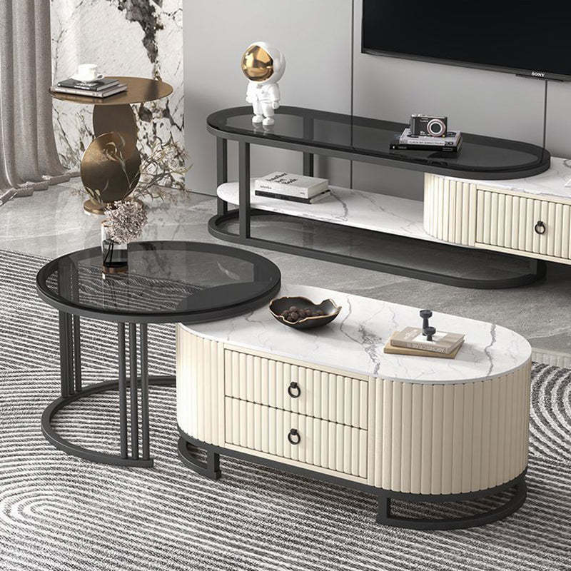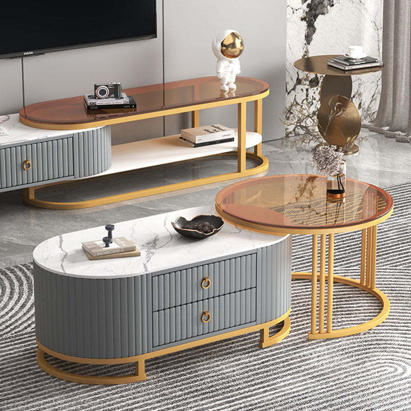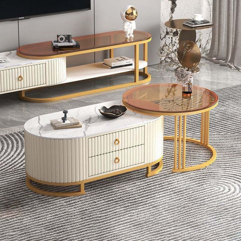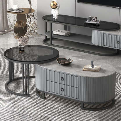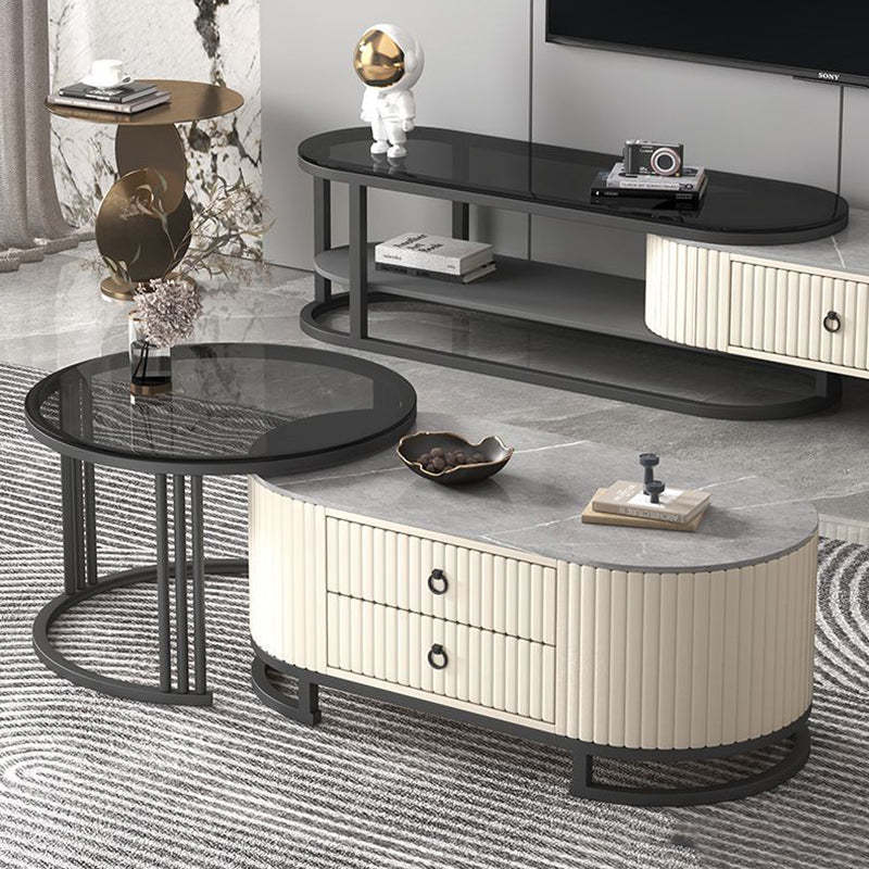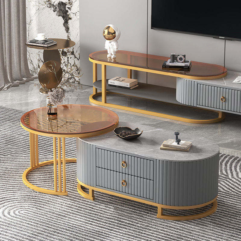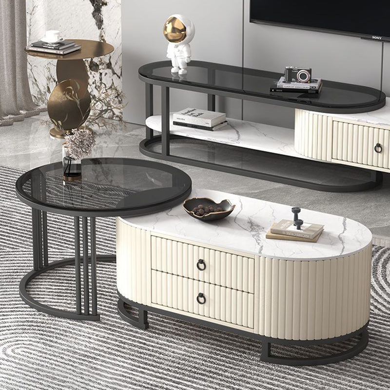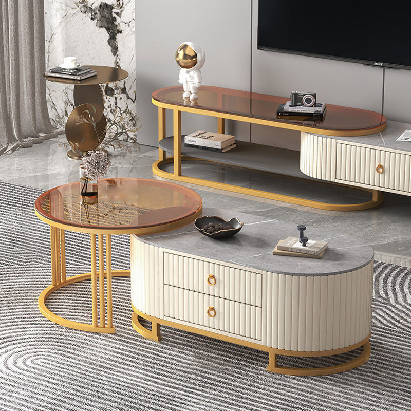 Modern Minimalist Slab Wood Leather Metal Elliptical TV Stand 2-Drawer Extendable For Living Room