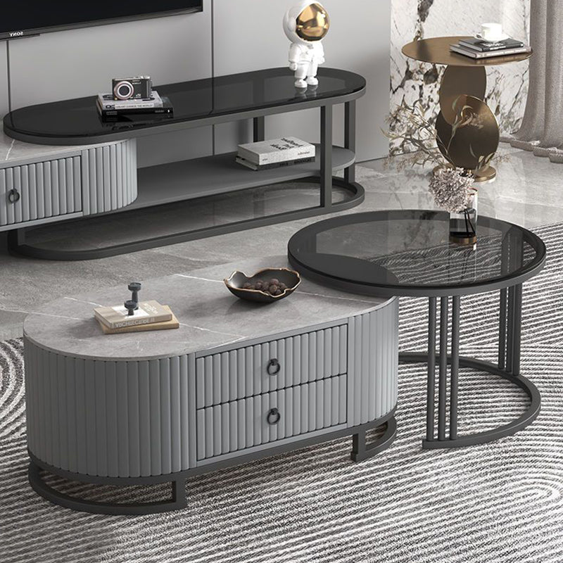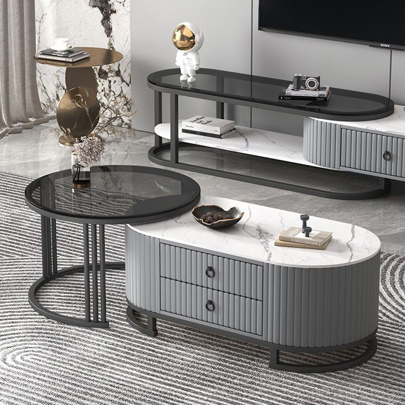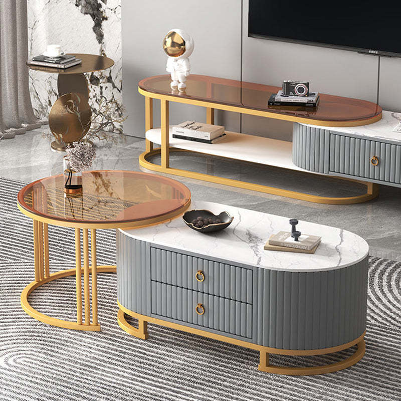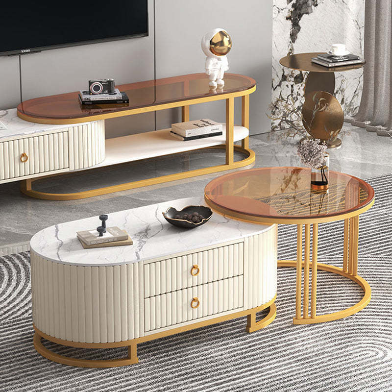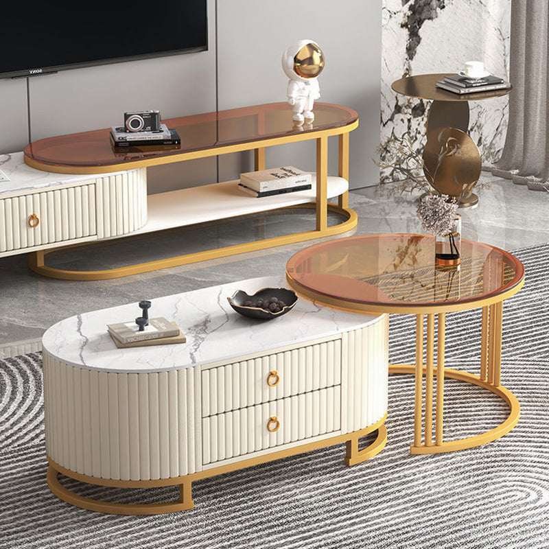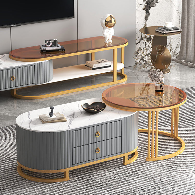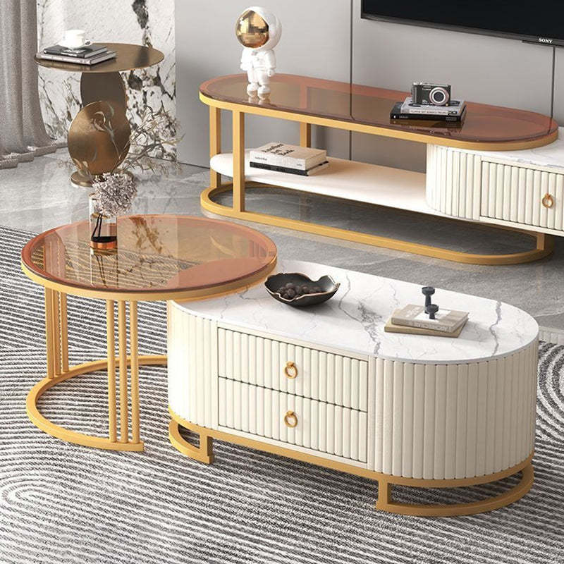 Modern Minimalist Slab Wood Leather Metal Elliptical TV Stand 2-Drawer Extendable For Living Room