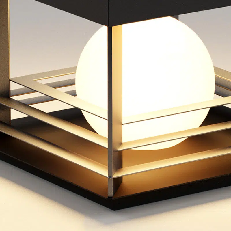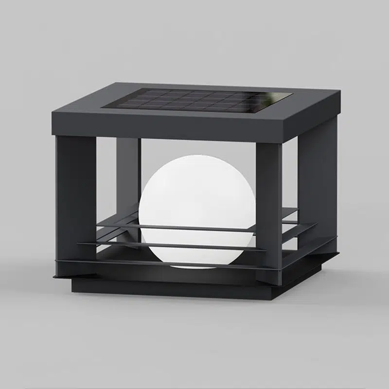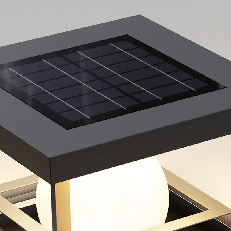 This black solar-powered LED post light combines a cuboid base with a globe top. crafted from durable PC and stainless steel. Ideal for patios and garden pillars. it features waterproof protection and energy-saving solar functionality for long-lasting outdoor illumination.
