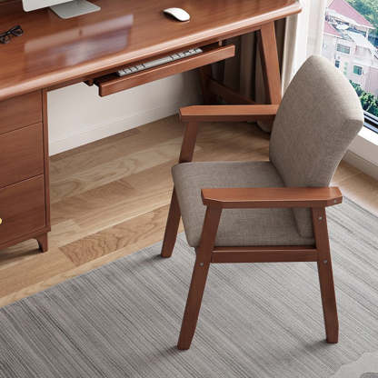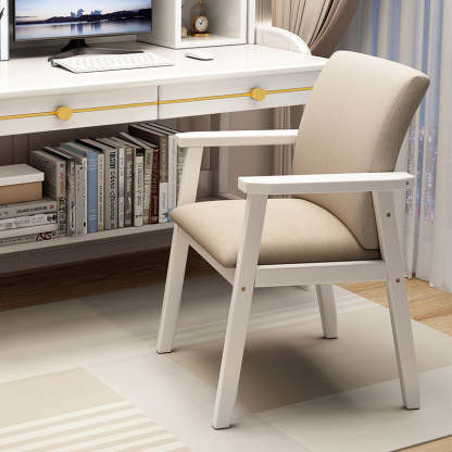 This modern dining chair features a solid wood frame. soft fabric seat. and an ergonomic curved backrest with supportive armrests. Available in walnut. cherry. natural wood. and white finishes. its wide seat and sturdy build make it ideal for long-lasting dining comfort in homes. hotels. or dorms.