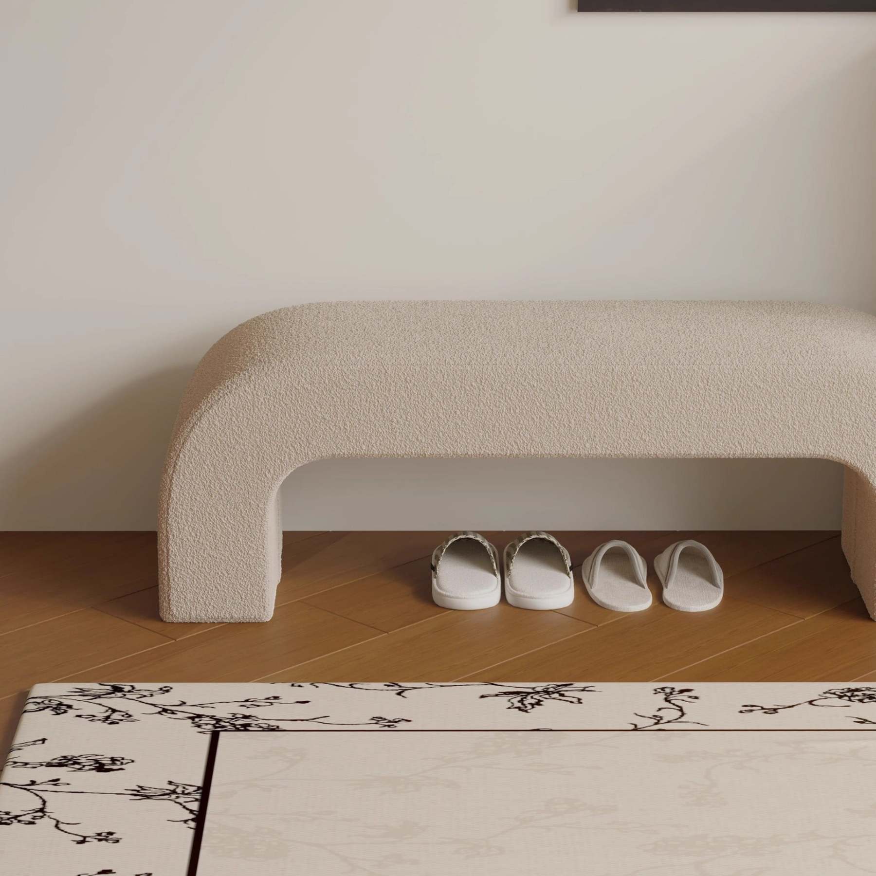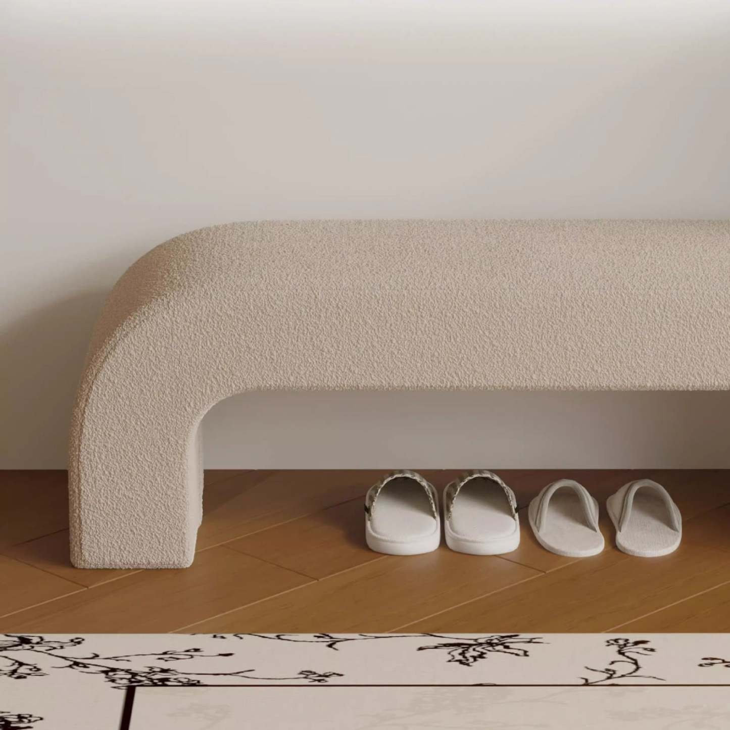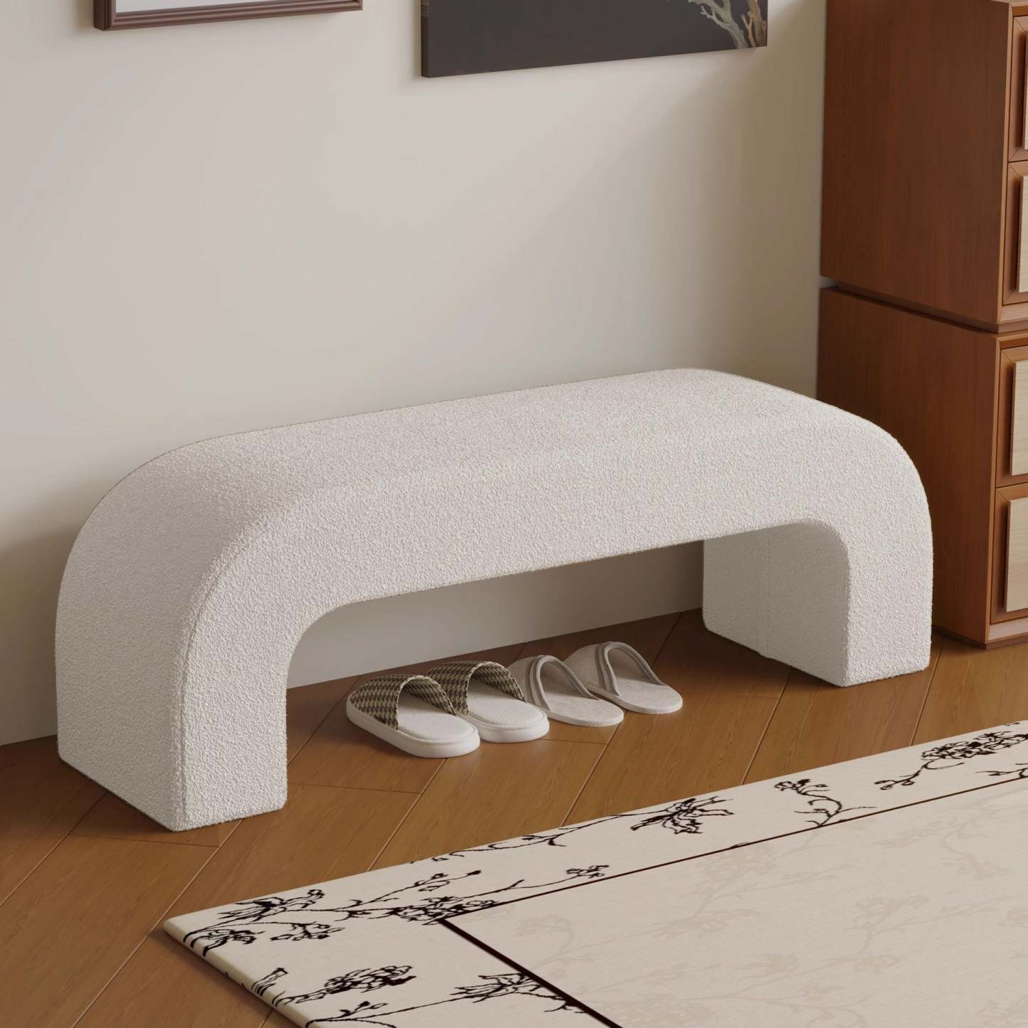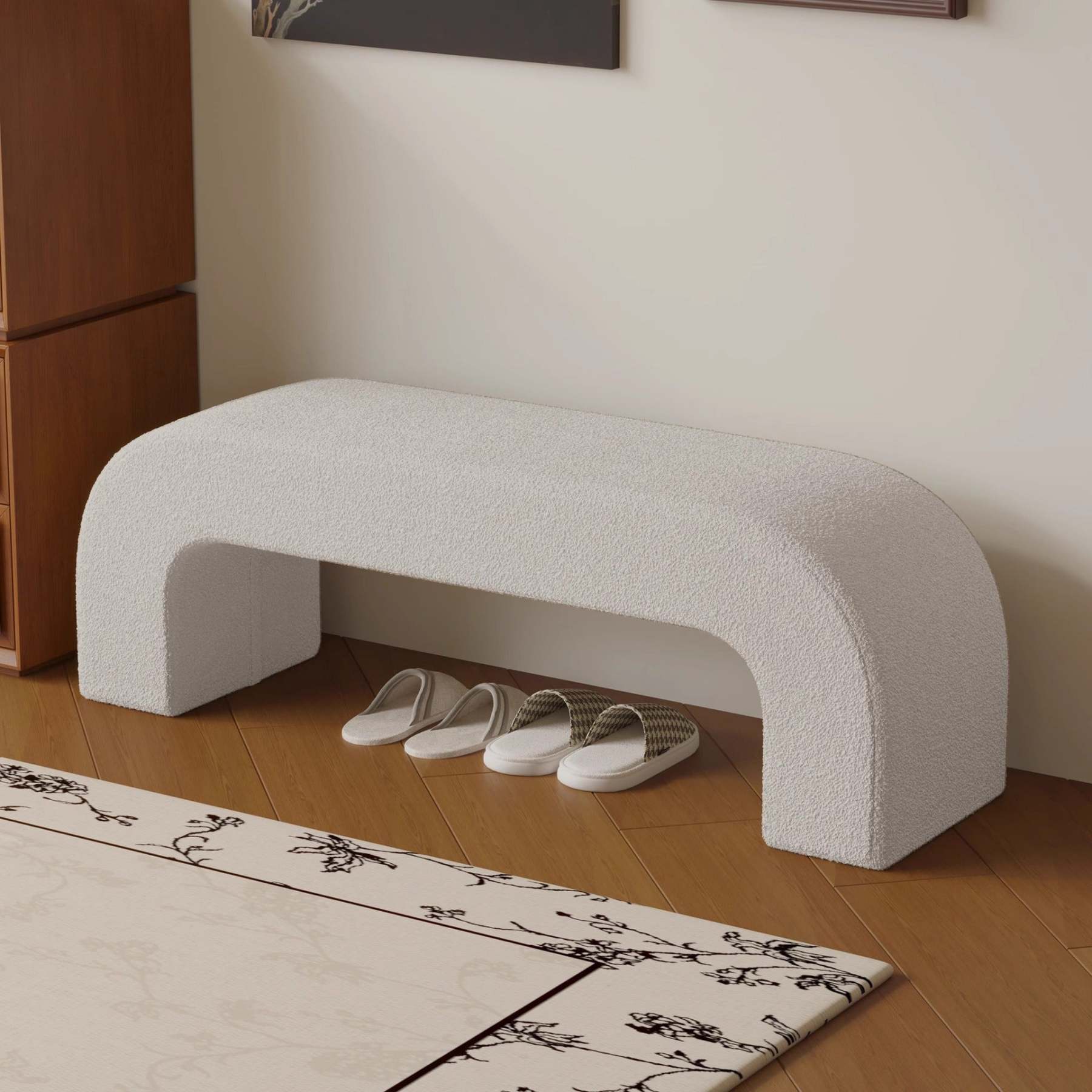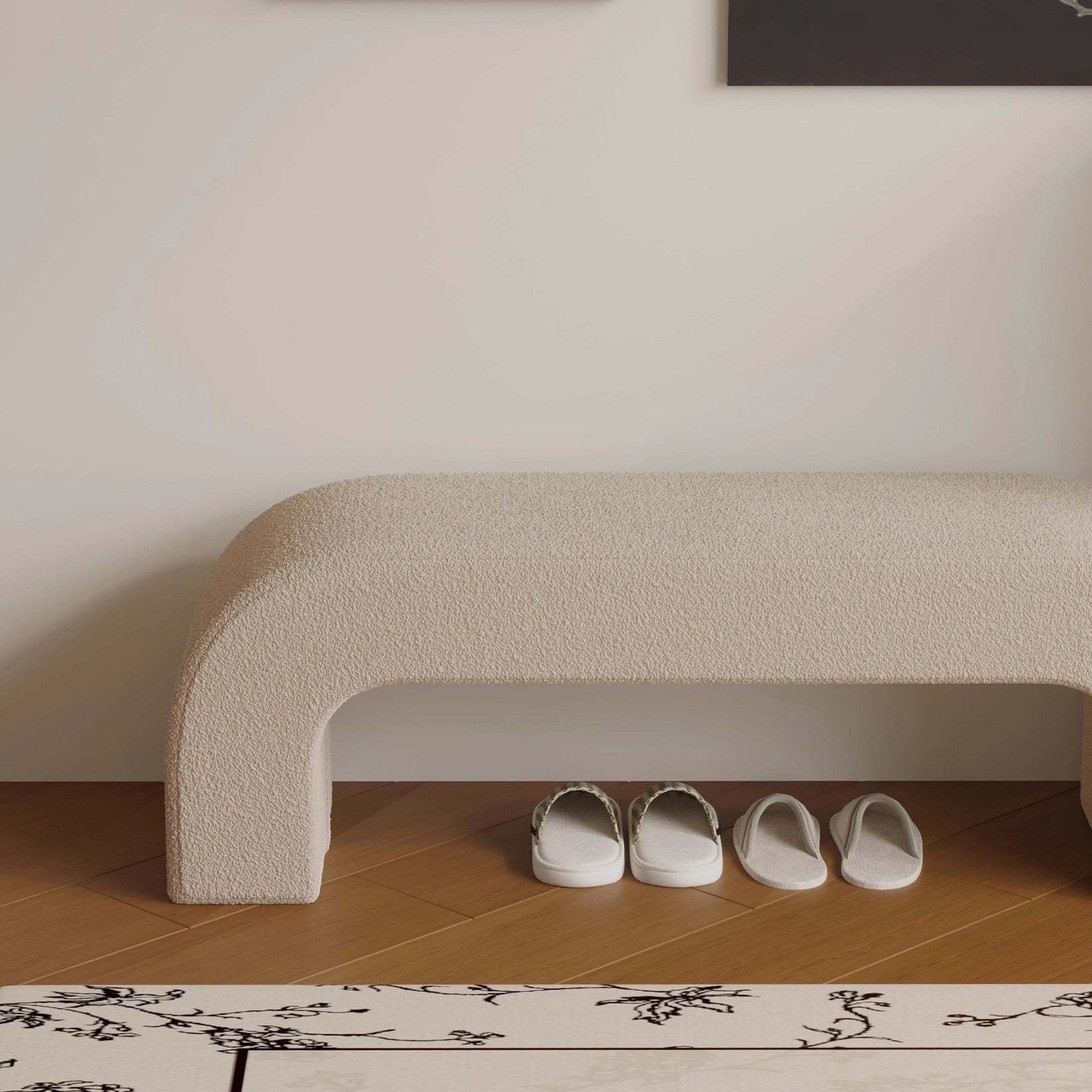 Bring modern simplicity to your entryway or living room with this rectangular bench. upholstered in soft lambswool or sleek leather. Available in multiple colors. its open base design provides convenient space for storing shoes while keeping your area neat and stylish.