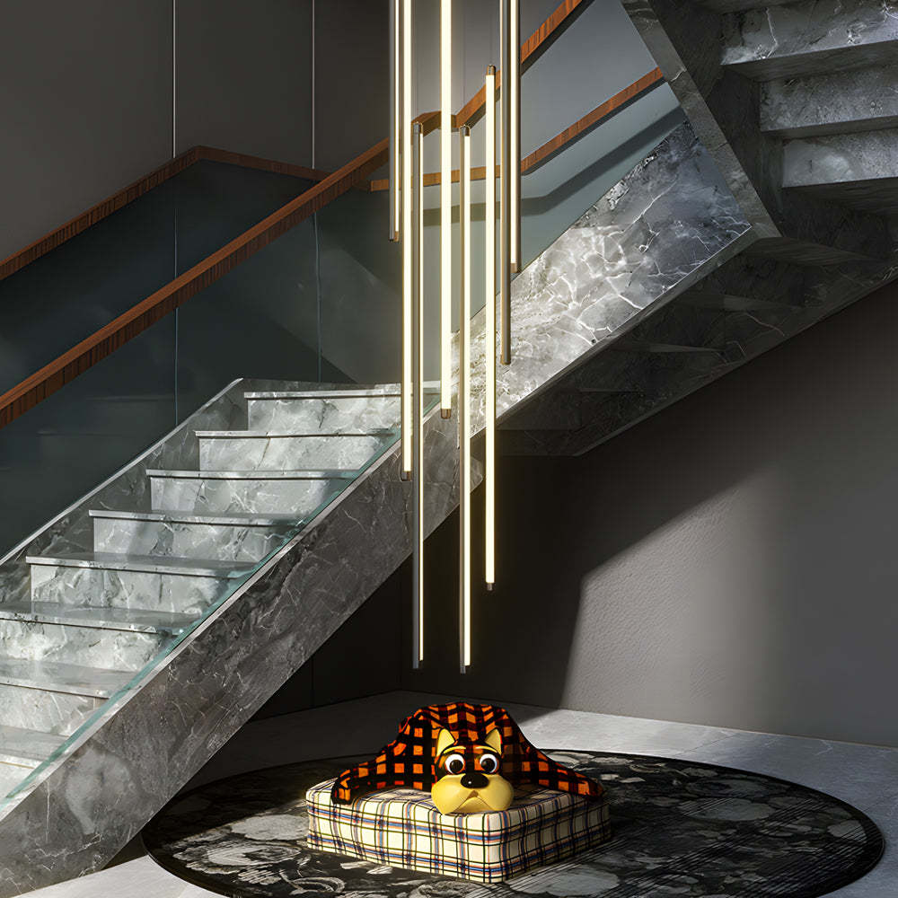 - This staircase chandelier is composed of quality aluminum, and it comes with an acrylic shade and built-in LED light sources ensuring bright and even lighting, and providing a long-lasting lighting solution for your home. Its spiral shape and adjustable hanging wire design allow for versatility in various spaces, making it perfect for living rooms, villas, staircases, and duplex buildings.