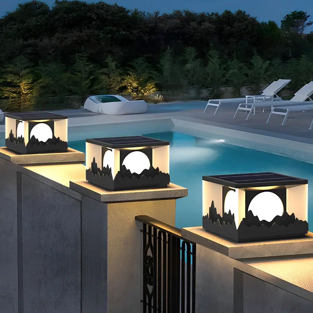 - Solar fence post lights are designed with a classic mountain scenery pattern. which makes the lamps more exquisite. not only as lighting tools. but also as outdoor decorations.