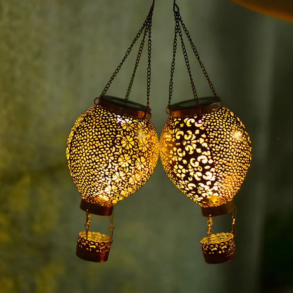 • The sturdy chains and top hook allow this metal hot air balloon solar lantern to be hand-held or easily hung from a tree branch. gazebo. or porch. You only need to place the lantern in direct sunlight to charge during the day. and then you can enjoy its soft illumination throughout the evening. It is perfect for various parties or holiday decorations. such as Christmas and more.