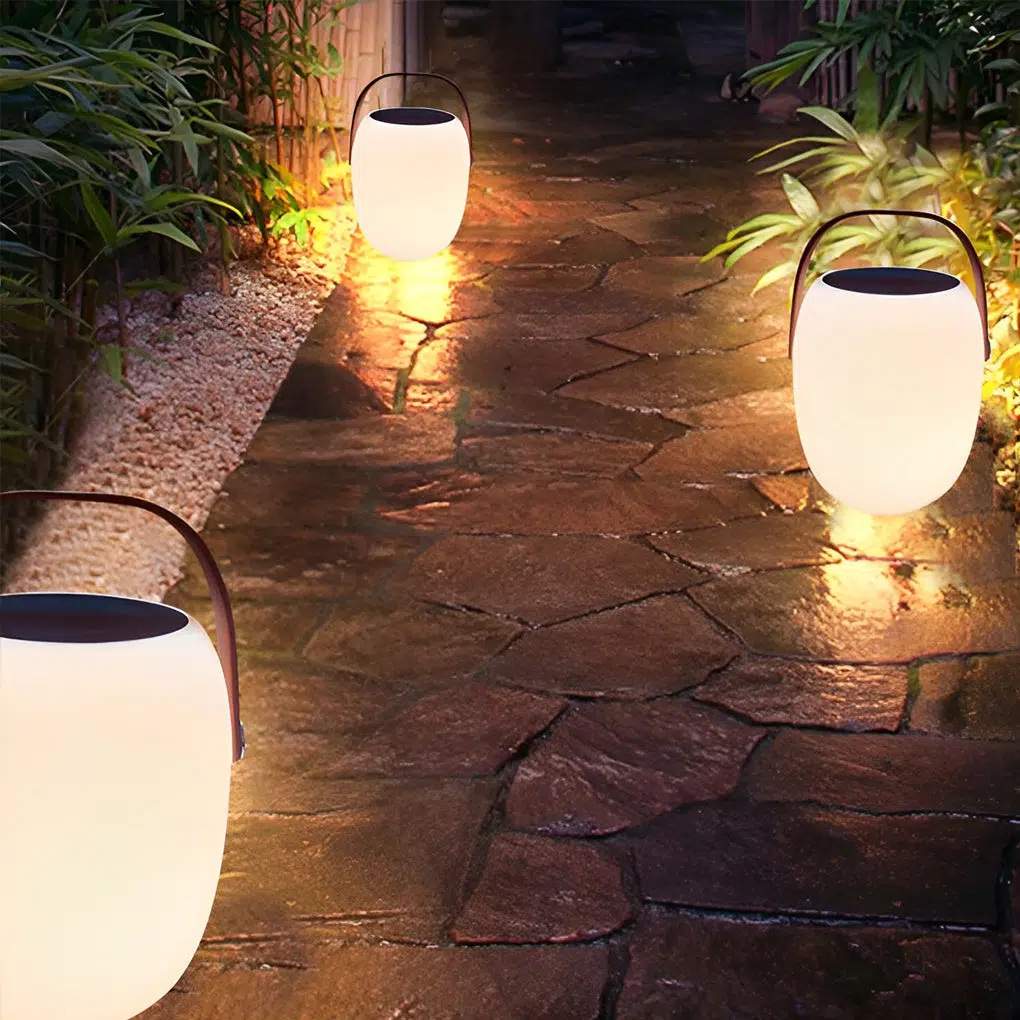 - This solar garden light is charged by solar energy. which has high charging efficiency. fast charging speed and long battery life. The outdoor light’s comfortable handle design is easy to move and carry. so you can take it with you when camping. picnicking and walking.