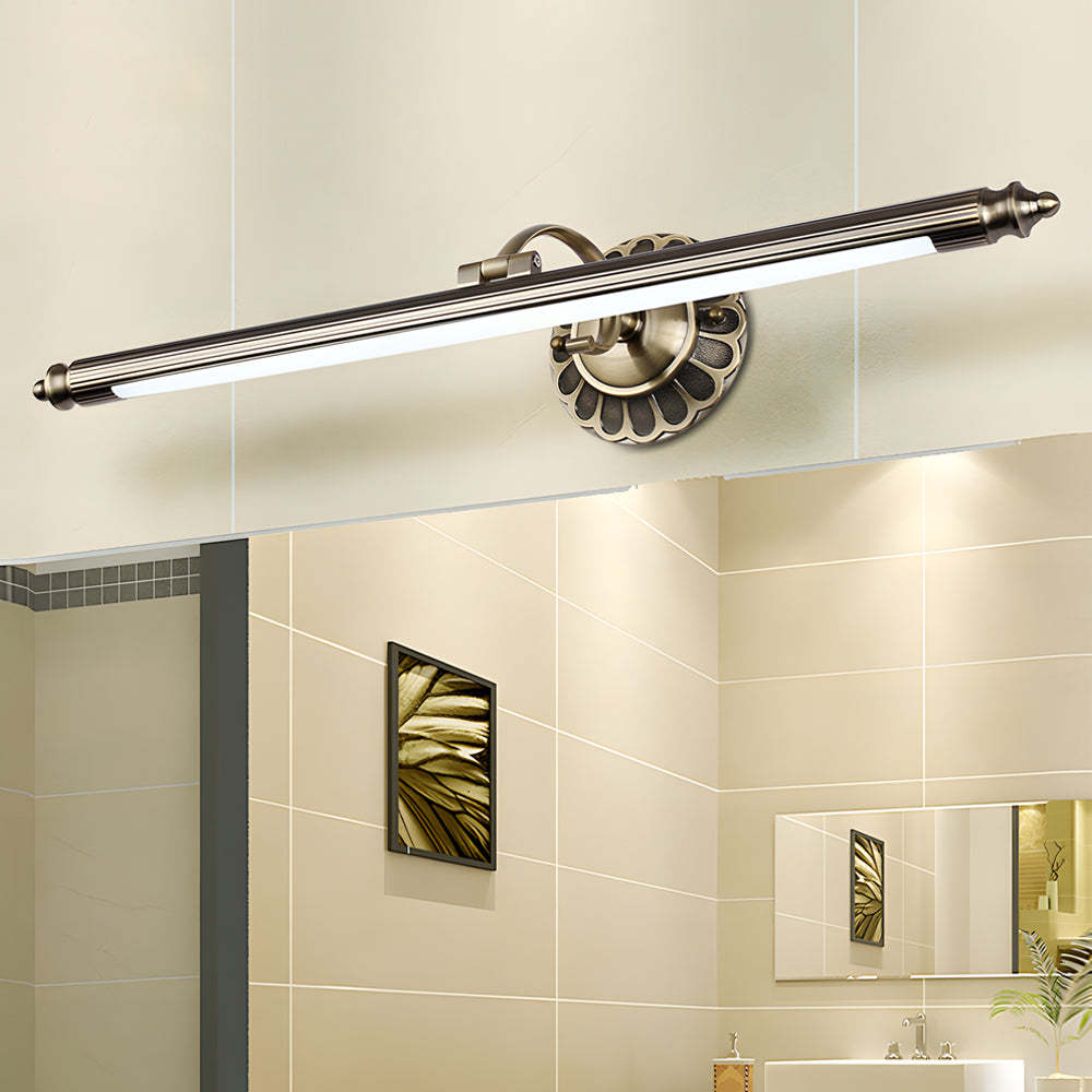 - Add vintage charm to your bathroom with this retro-inspired cylinder LED vanity light. Featuring a timeless cylindrical design with retro detailing at end of linear bar, and flower-patterned accents on the metallic wallplate, this fixture brings elegance and character to any bathroom.