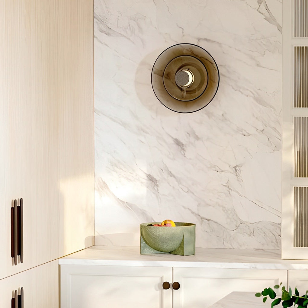 - The round wall light fixture is made of glass and metal materials. and its lamp body is well-crafted and durable. The glass lampshade has high light transmittance and is not easy to break. revealing fashionable taste and showing the warmth of home.