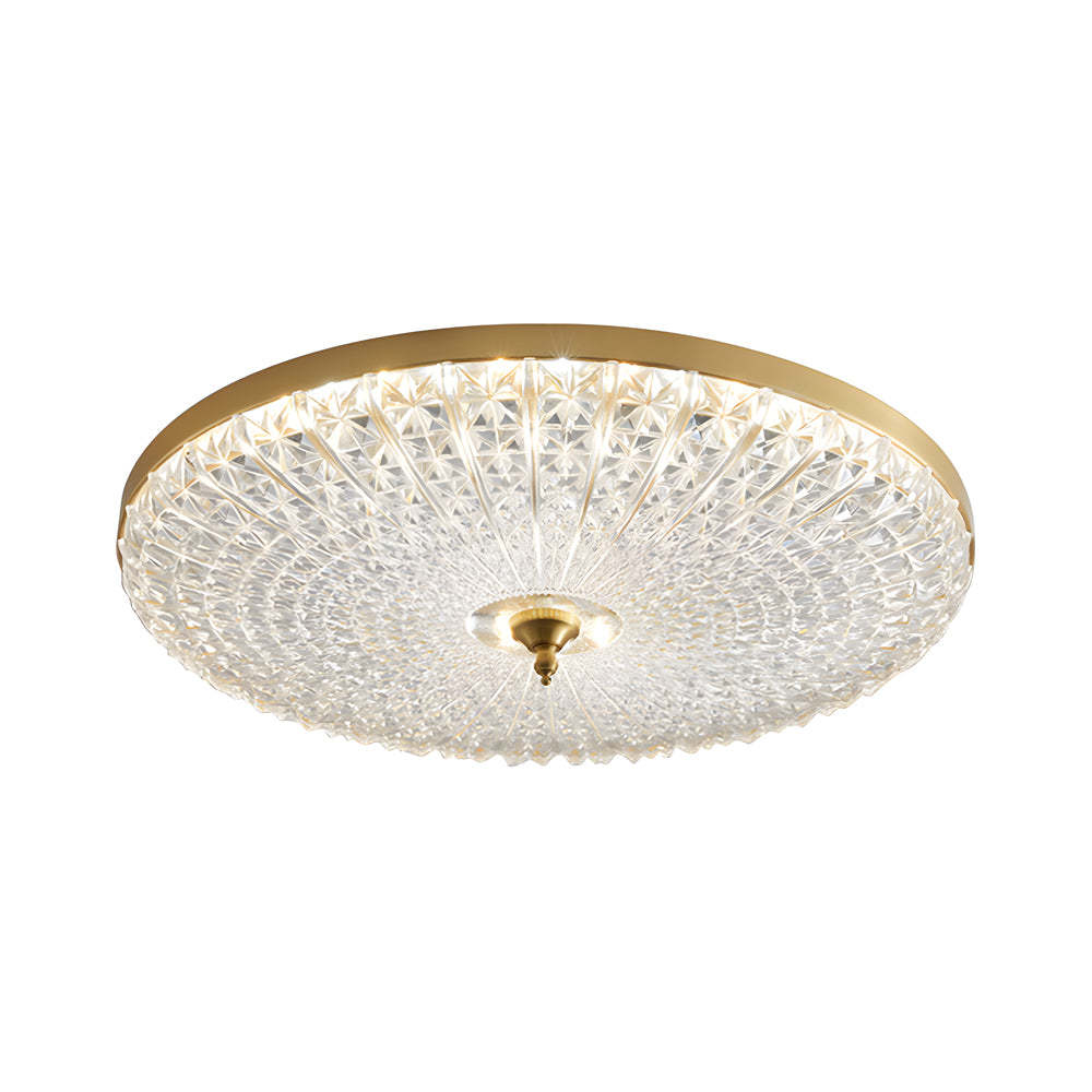 - This Sparkle Glass LED Flush Ceiling Light features a sleek copper frame, available in elegant gold or bold black finishes, creating a striking contrast with its sparkle glass shade. The round, glass shade exudes a refined simplicity, luxurious to blend seamlessly with contemporary interiors.