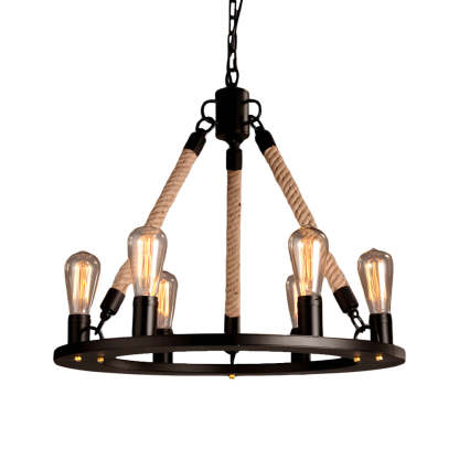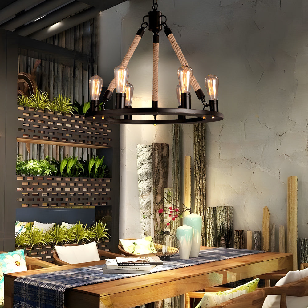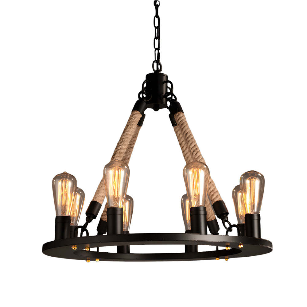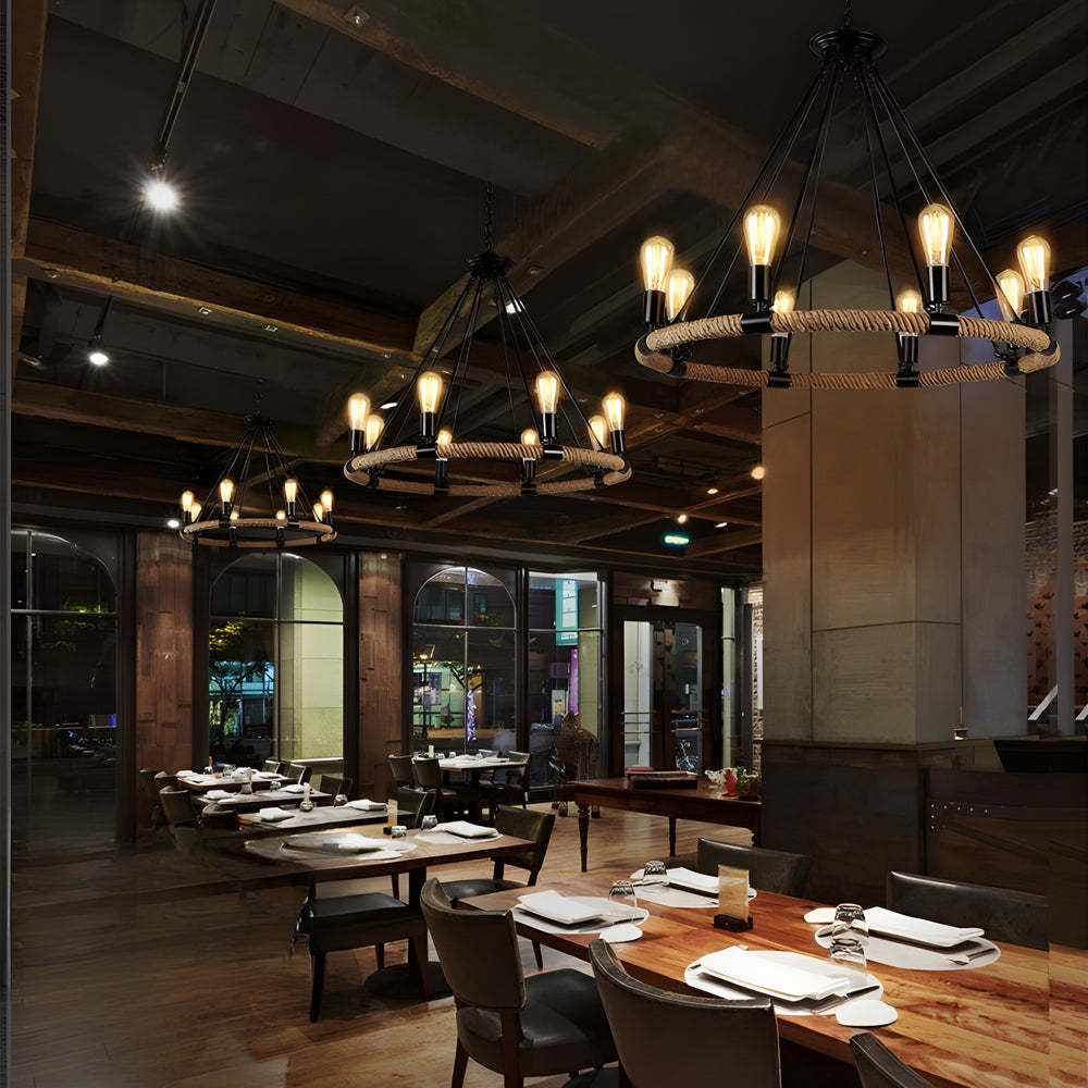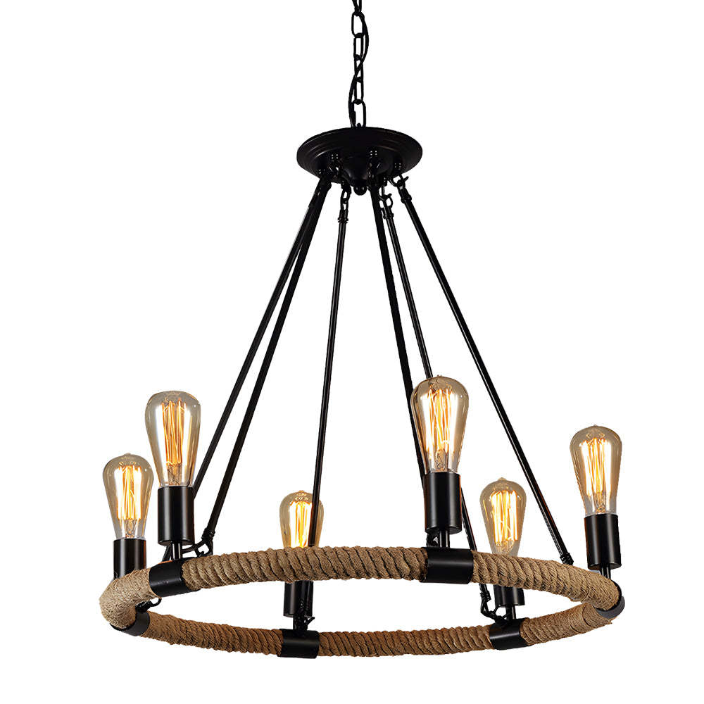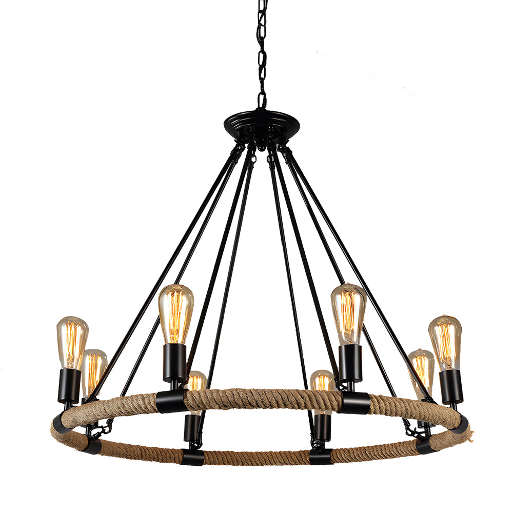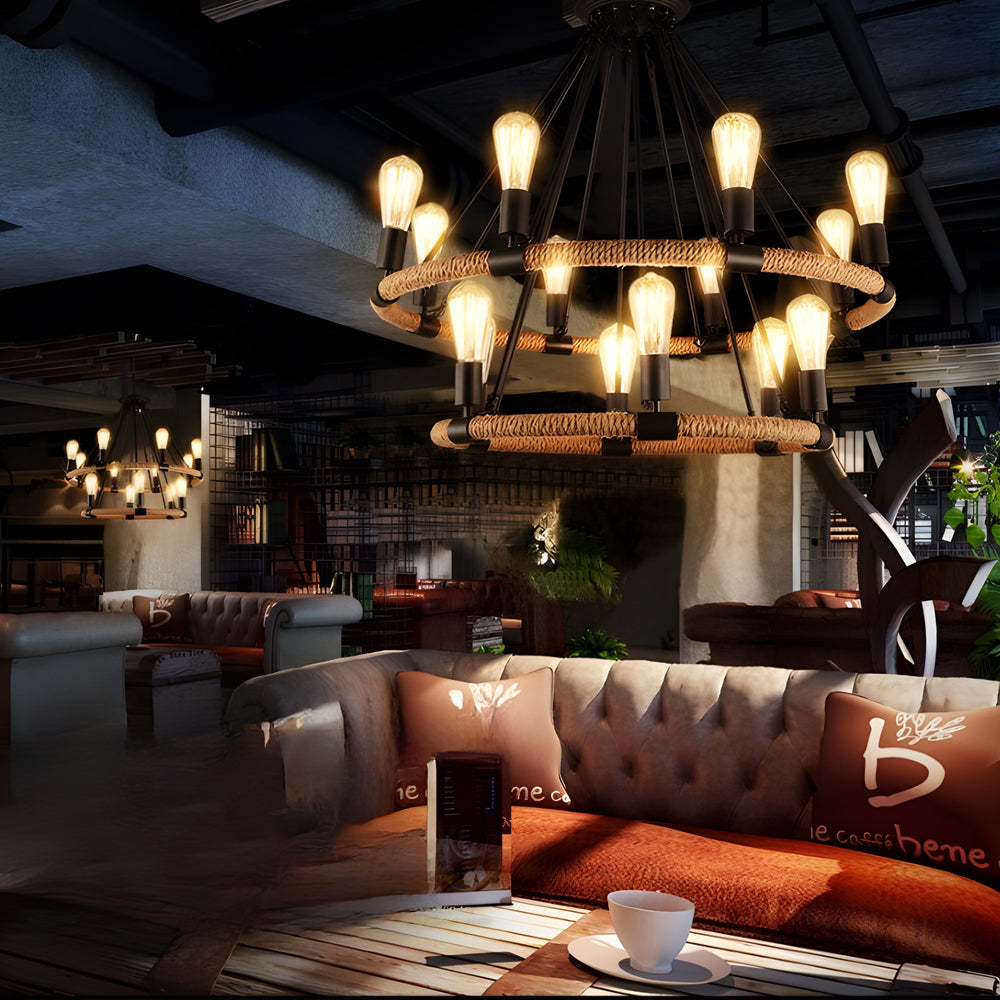 - Embrace the vintage charm and rustic beauty of our Industrial Vintage Hemp Rope Double Layer Iron Chandelier. Skillfully crafted with an iron frame wrapped in robust hemp rope, this chandelier features an intriguing double-layer design that creates a sophisticated layered visual effect. Each layer is equipped with E26 Edison bulbs that emit a warm, inviting glow, ideal for enhancing the ambiance of any room.